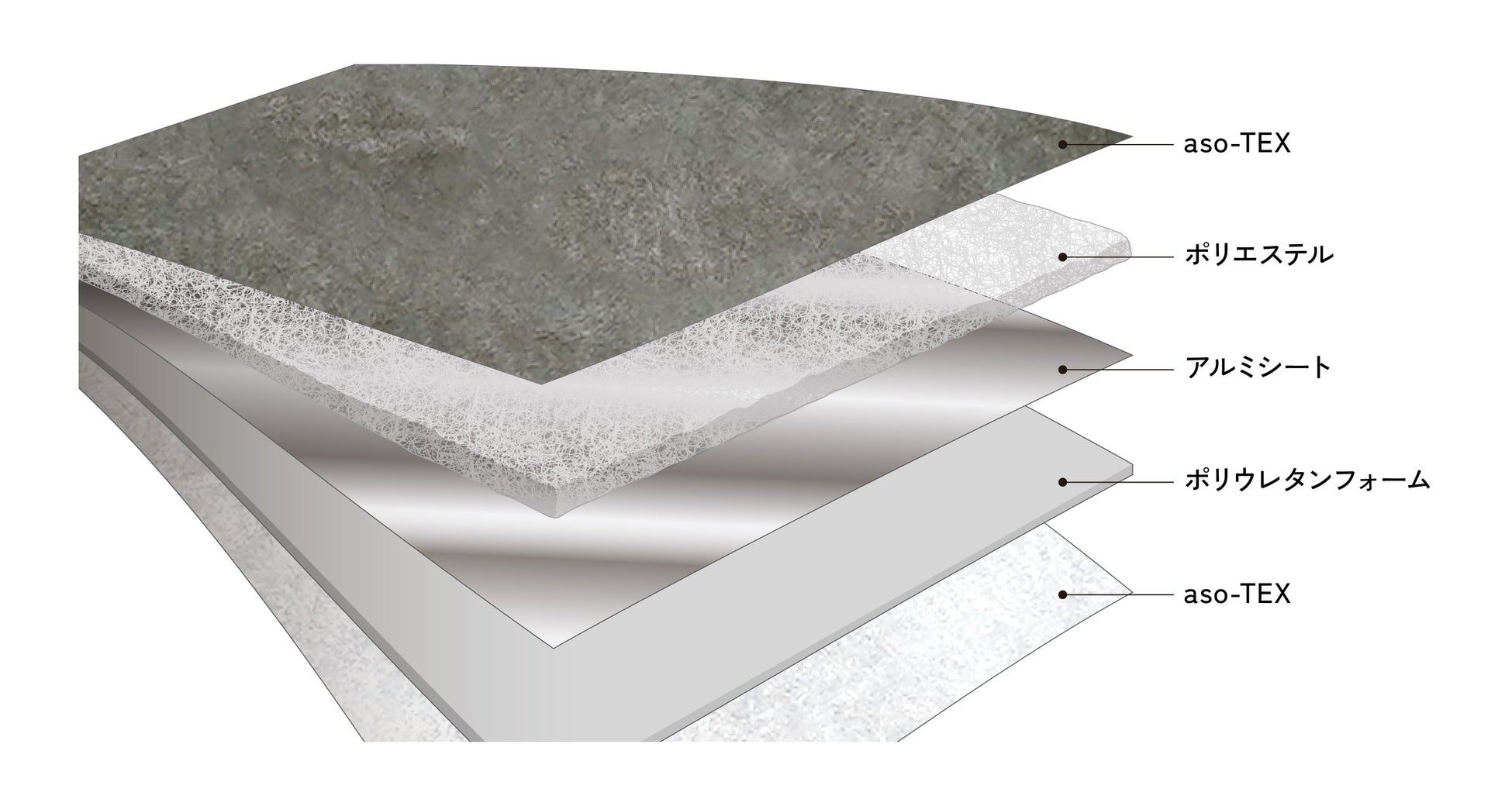 高い耐水性能をもつaso-TEXはお尻が濡れるのを防ぎ、内部のアルミシートが地面からの冷えを遮断します。