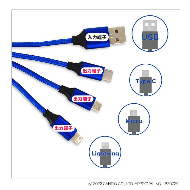 iPhoneやiPadなどで使用する「Lightning」、Andoridスマホやワイヤレスイヤフォン等で使用する「Micro」「Type-C」の出力端子3タイプと、入力端子である「USB」が1つにまとまっています。