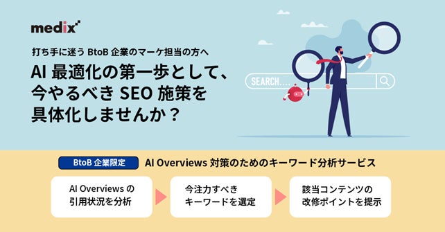 メディックスが、BtoB企業向け「AI Overviews対策のためのキーワード分析サービス」をリリース。AI最適化の第一歩としてのSEO施策を具体化