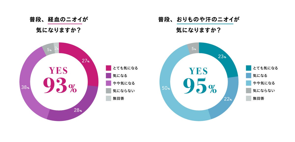 Be-A Japanとフィッツコーポレーションの両社が自社内外のモニターを募集して20~50代の女性60名を対象に行ったアンケート調査によると、『普段、経血のニオイが気になりますか?』という問いには93%が「気になる」と回答、また、『普段、おりものや汗のニオイが気になりますか?』という問いには95%が「気になる」と回答し、9割以上の方がデリケート臭を気にしているという結果となりました。