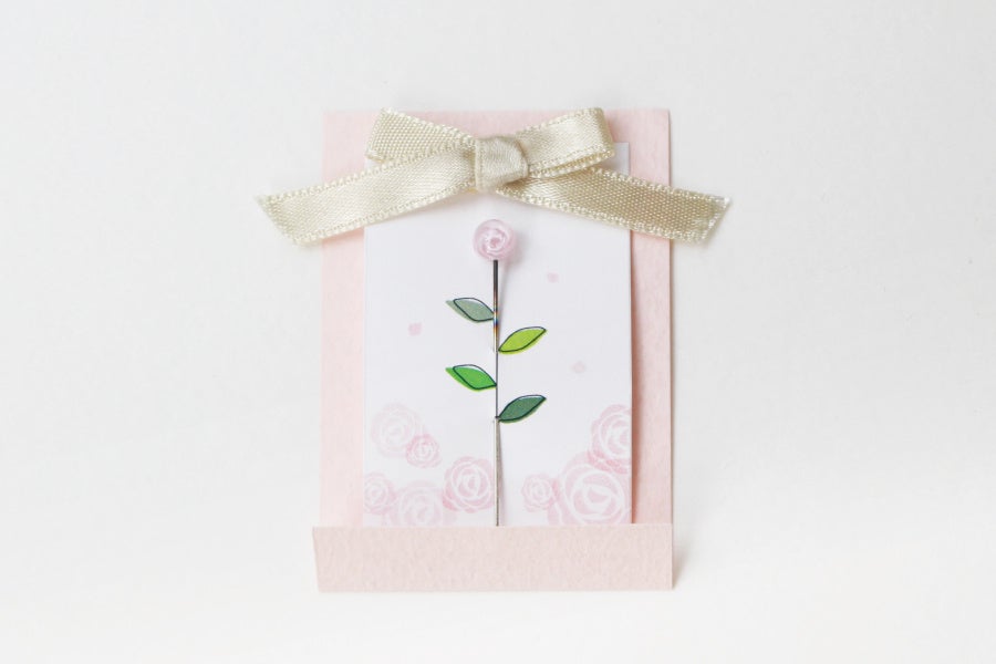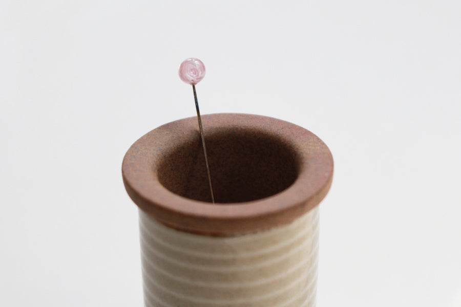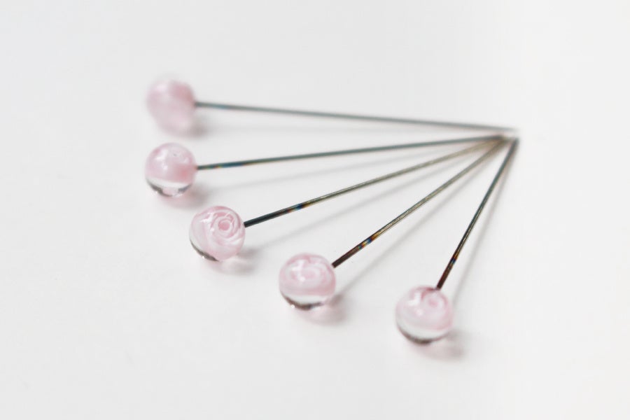 待針は、直径約5mmのトップに「ミルフィオリ」と呼ばれる花の模様の色ガラスでバラの花を表現しています。ガラスパーツを炎で溶かし、針に溶着させ花を表現するバーナーワークは、熟練の職人の技術が活かされています。