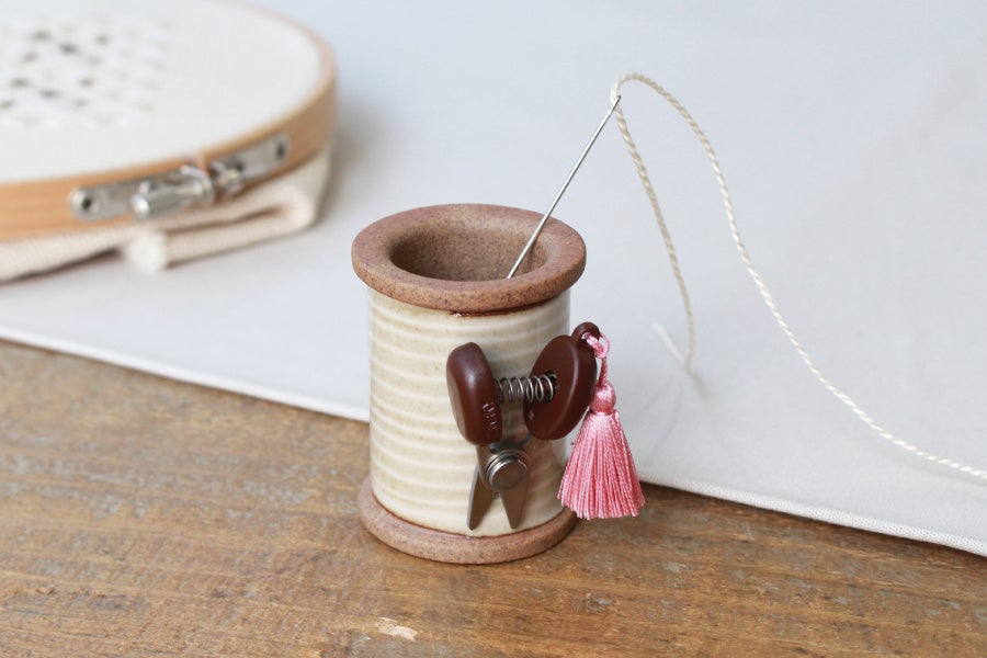 人気の「波佐見焼のマグネットスプール」に、新しく定番商品として「しろ」が仲間入りしました。今回はスプール単体のお値段で「とんぼ玉の待針 ばら」を1本そっと添えた、ギフトにぴったりなセットでお届けします。