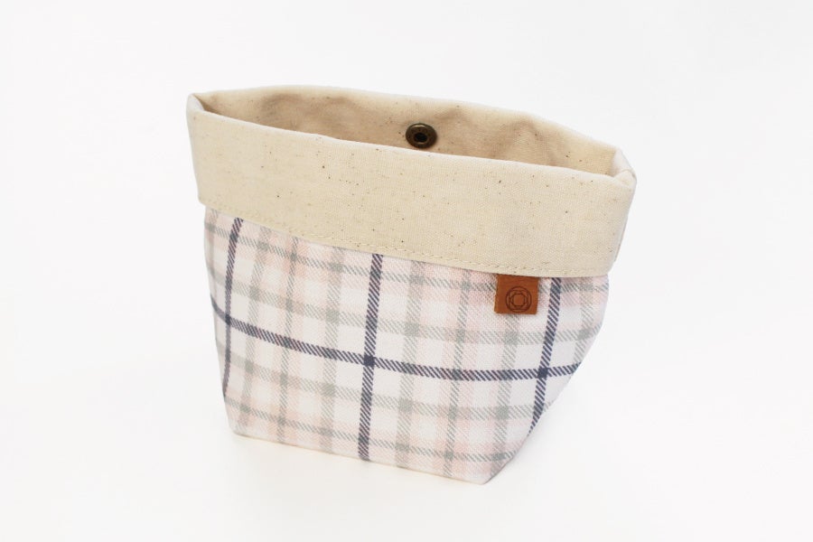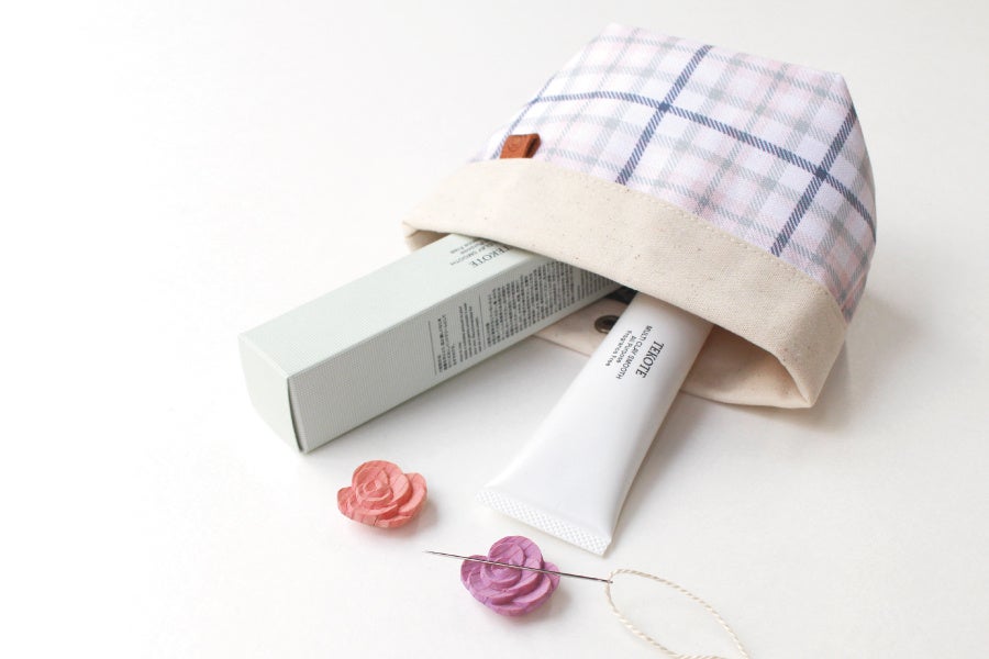 セットの小間物ポーチは、TEKOTEの象徴である格子柄をあしらいました。形を変えて使えるすぐれもので、内側のスナップボタンを使って、持ち運びに便利なポーチに。 ボタンを外せば、自立する小間物入れになります。さらに、折り返しの部分を伸ばして使うと、編み針などの長めの道具の収納にも活用できます。