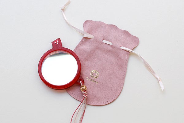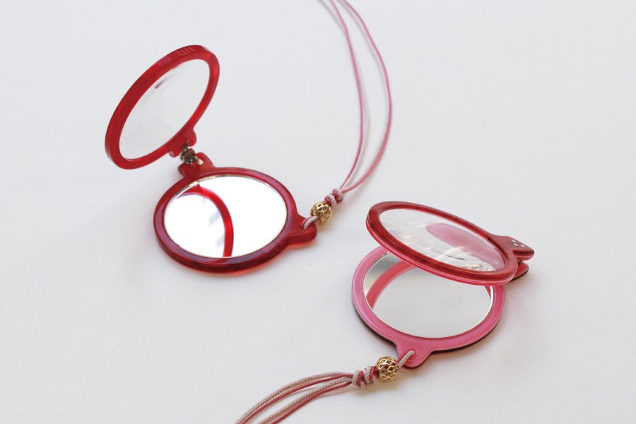 便利なネックレス紐を付けた特別仕様。胸元を彩るアクセサリーとして楽しみつつ、鏡付きなので身だしなみチェックもスマートに。