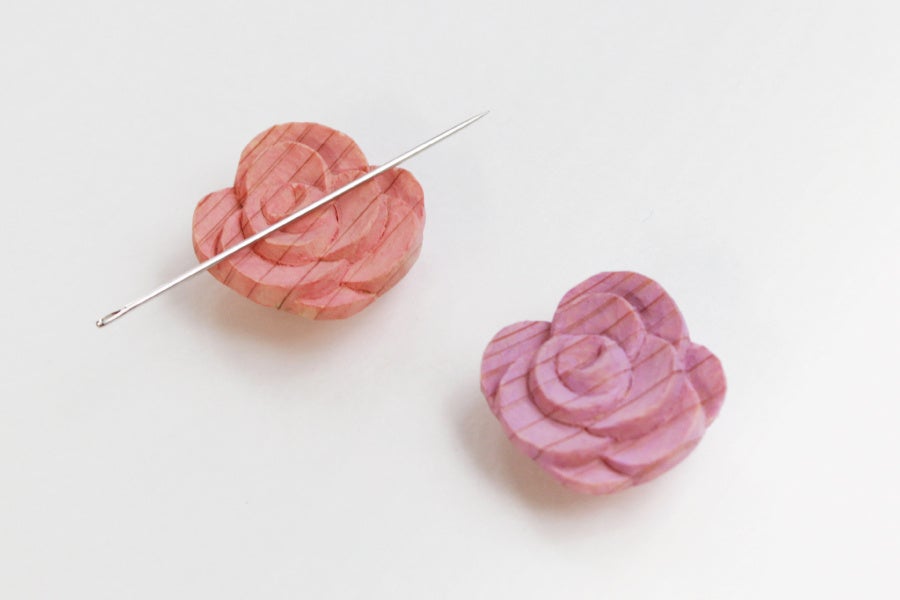 繊細な彫りが施された「木彫りのニードルマインダー ばら」は、内蔵マグネットが針をしっかりキャッチ。天然木ならではの温もりある風合いと、一つひとつ異なる表情豊かな木目の美しさをお楽しみいただけます。バラが持つ「愛・美・輝き・情熱」という花言葉に想いをのせて、2つの色をご用意しました。