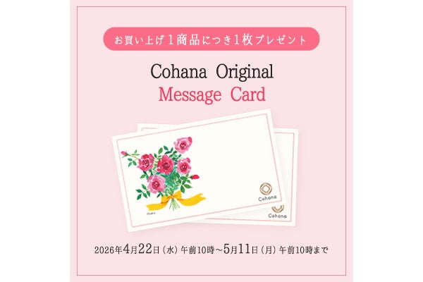 また、期間中、Cohanaオンラインストア・Cohana日本橋本店にて、お買い上げ1商品につき1枚、オリジナルメッセージカードを差し上げます。母の日の贈り物に添えるのはもちろん、用途を限定しない柔らかなデザインですので、さまざまな贈り物のシーンにもお使いいただけます。