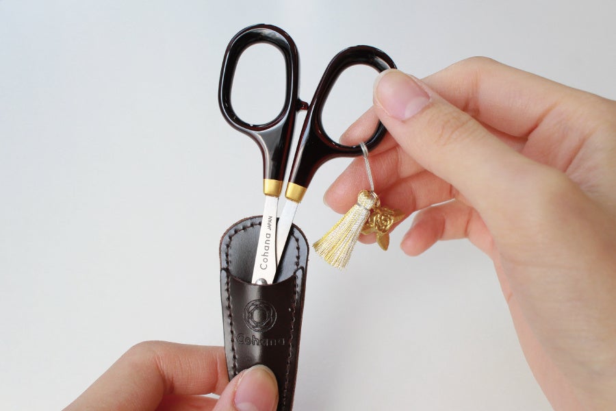 Cohanaで愛され続ける、定番の漆と金蒔絵の小ばさみ 溜塗り。定番品と同価格にて、限定の「真ちゅうのばらのチャーム」を添えた特別な装いでお届けします。流行に左右されない定番の美しさに華やかさが添えられ、大切な方への贈り物としてもおすすめです。