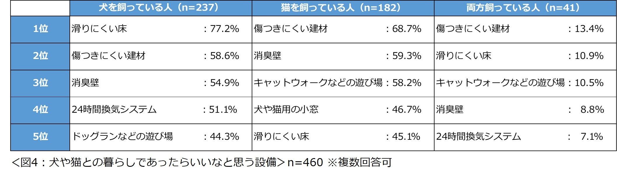 「犬や猫との暮らしであったらいいなと思う設備は何ですか?」と尋ねたところ、犬を飼っている人の1位は「滑りにくい床」(77.2%)、猫を飼っている人の1位は「傷つきにくい建材」(68.7%)という結果になりました。(図4)