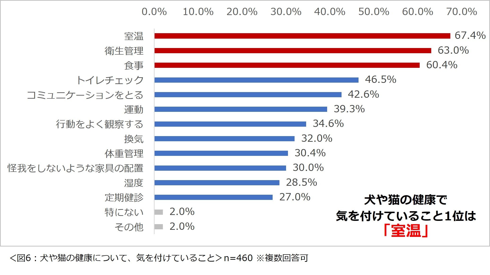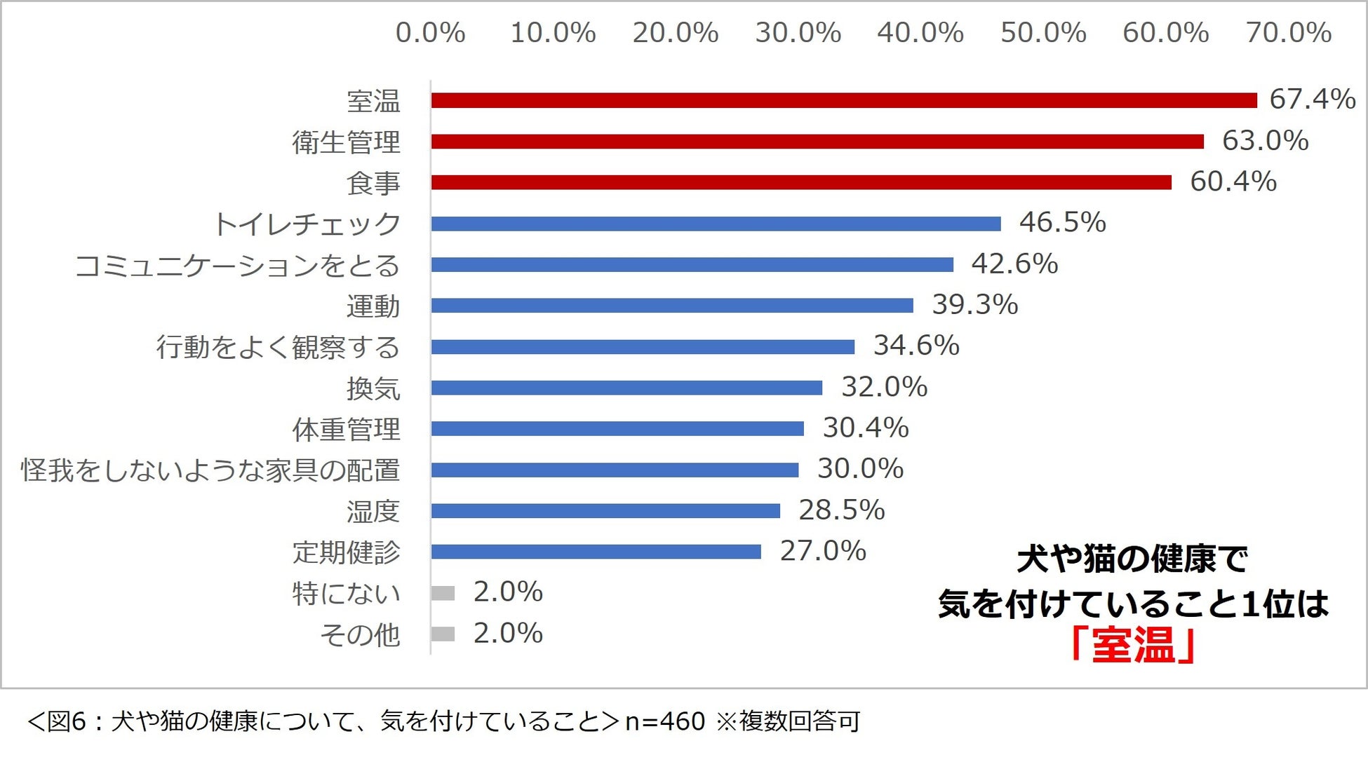 犬や猫の健康で気をつけていることは、1位「室温」、2位「衛生管理」、3位「食事」