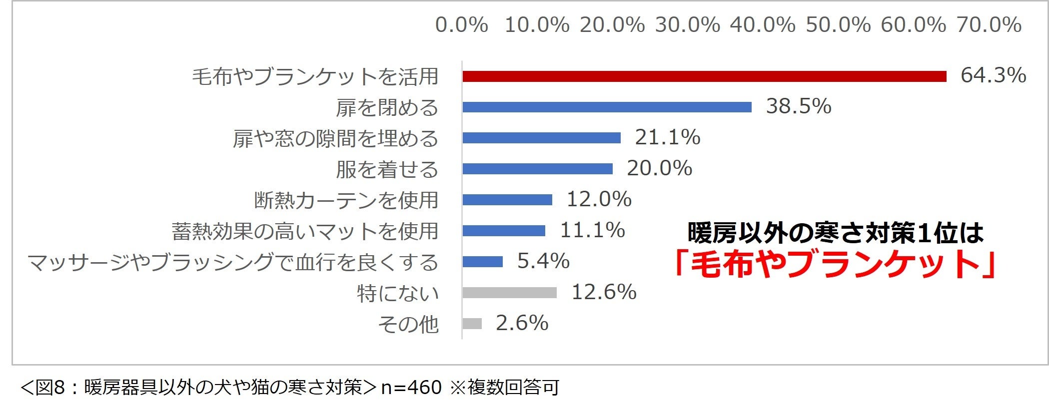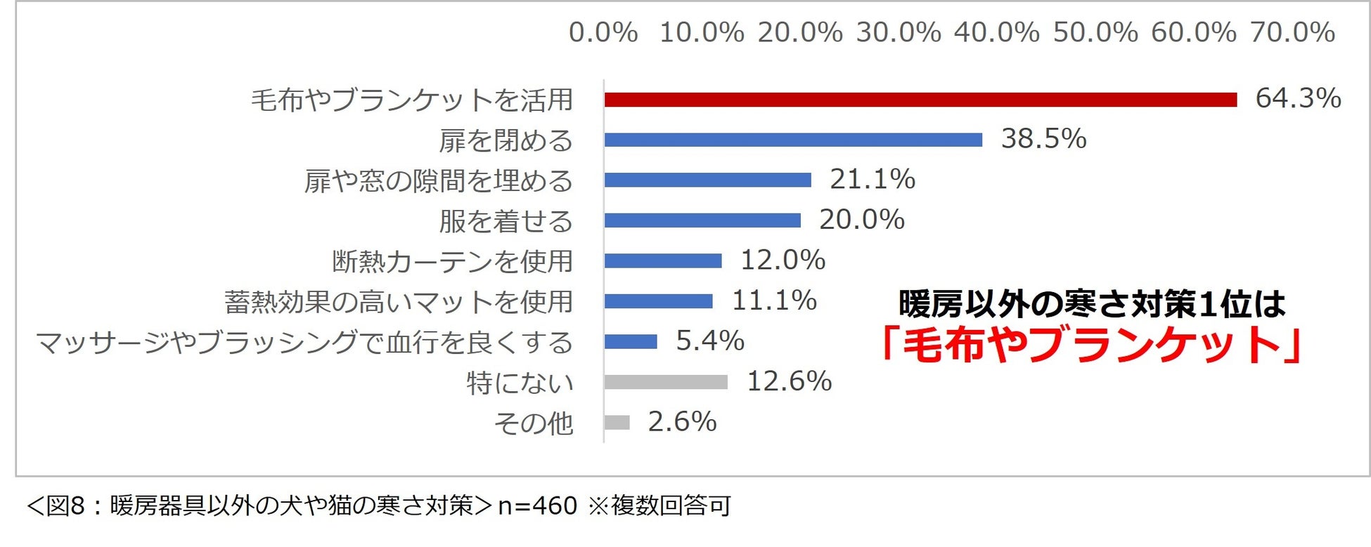 また、「暖房以外で何か犬や猫の寒さ対策をしていますか?」と尋ねたところ、「毛布やブランケット」を活用している人が最も多く64.3%という結果になりました。(図8)