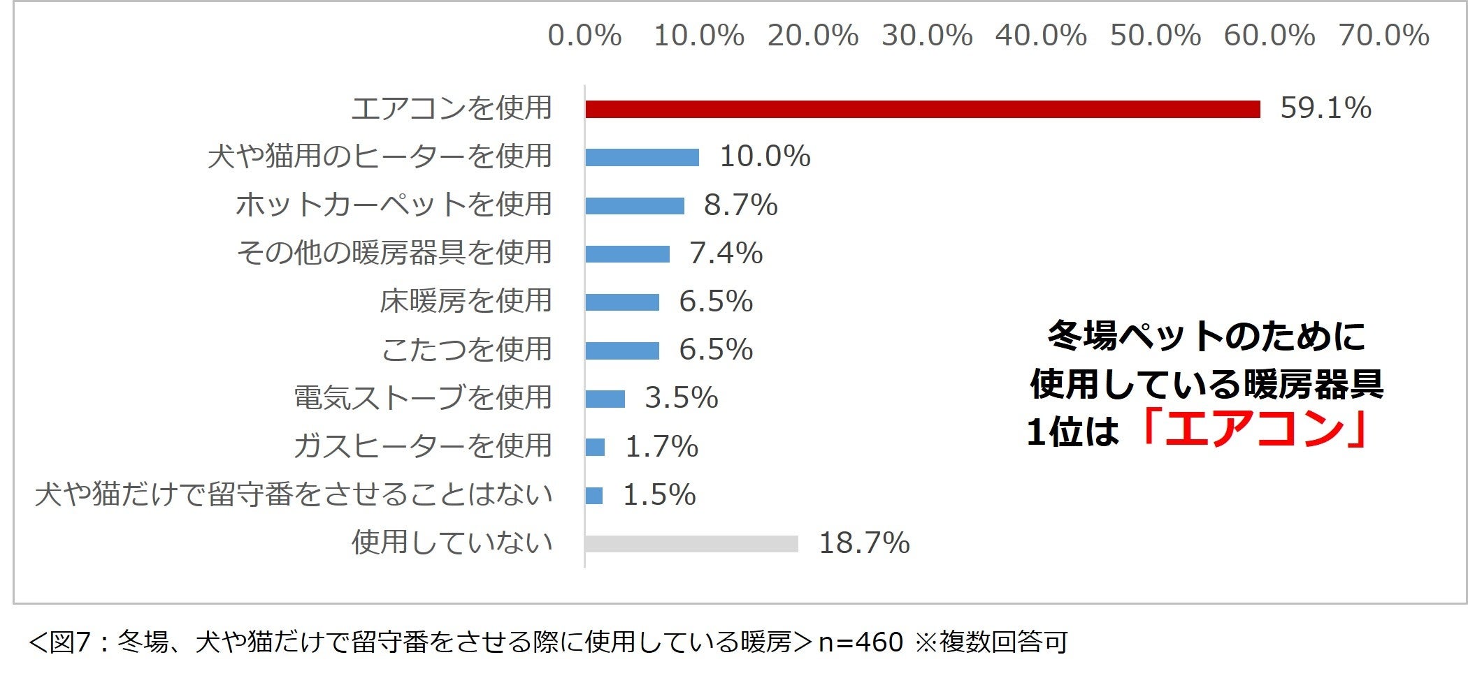 「冬場、犬や猫だけで留守番をさせる際に暖房を使用していますか?」と尋ねたところ、「エアコン」を使用している人が最も多く59.1%という結果になりました。(図7)