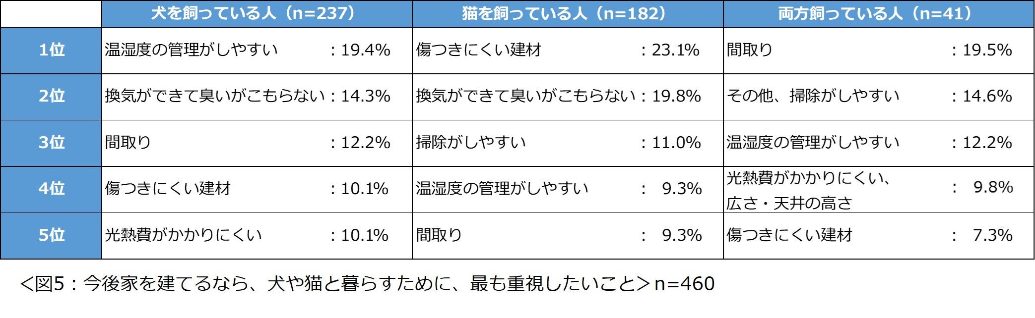 「今後家を建てるなら、犬や猫と暮らすために、最も重視したいことは何ですか?」と尋ねたところ、犬を飼っている人の1位は「温湿度の管理がしやすい」で19.4%、猫を飼っている人の1位は「傷つきにくい建材」で23.1%と最も多い結果になりました。また犬、猫とも2位は「換気ができて臭いがこもらない」という結果になりました。(図5)