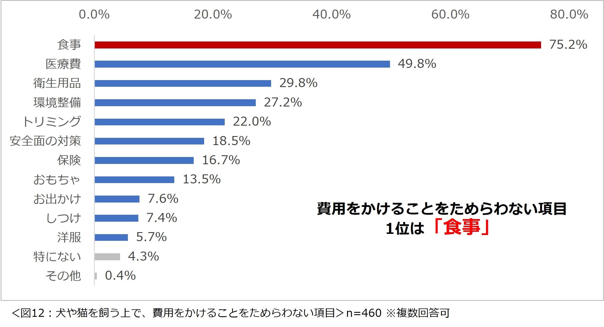 「犬や猫を飼う上で、費用をかけることをためらわない項目は何ですか?」と尋ねたところ、「食事」という回答が最も多く75.2%という結果になりました。(図12)