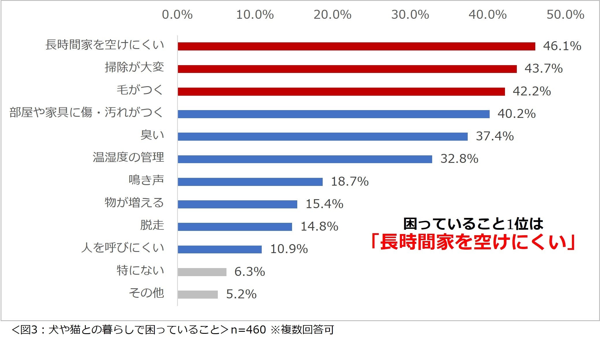 「犬や猫との暮らしで困っていることは何ですか?」と尋ねたところ、1位「長時間家を空けにくい」(46.1%)、2位「掃除が大変」(43.7%)、3位「毛がつく」(42.2%)という結果になりました。(図3)