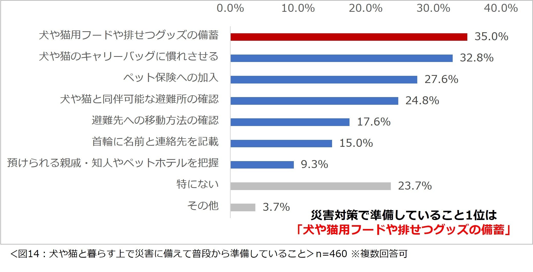 「犬や猫と暮らす上で災害に備えて普段から準備していることはありますか?」と尋ねたところ、「犬や猫用フードや排せつグッズの備蓄」という回答が最も多く35%という結果になりました。(図14)