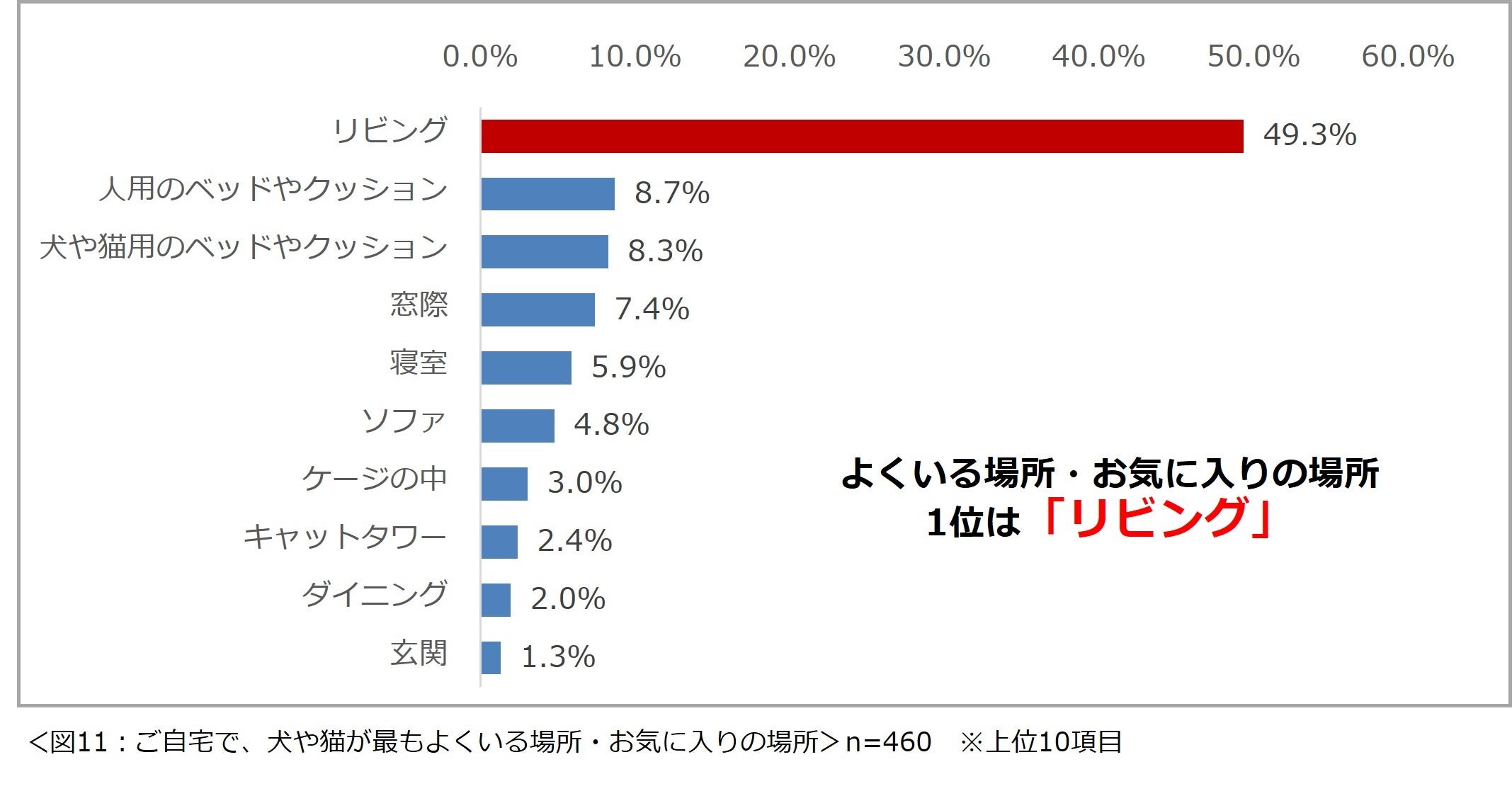「ご自宅で、犬や猫が最もよくいる場所・お気に入りの場所はどこですか?」と尋ねたところ、「リビング」という回答が最も多く49.3%という結果になりました。(図11)