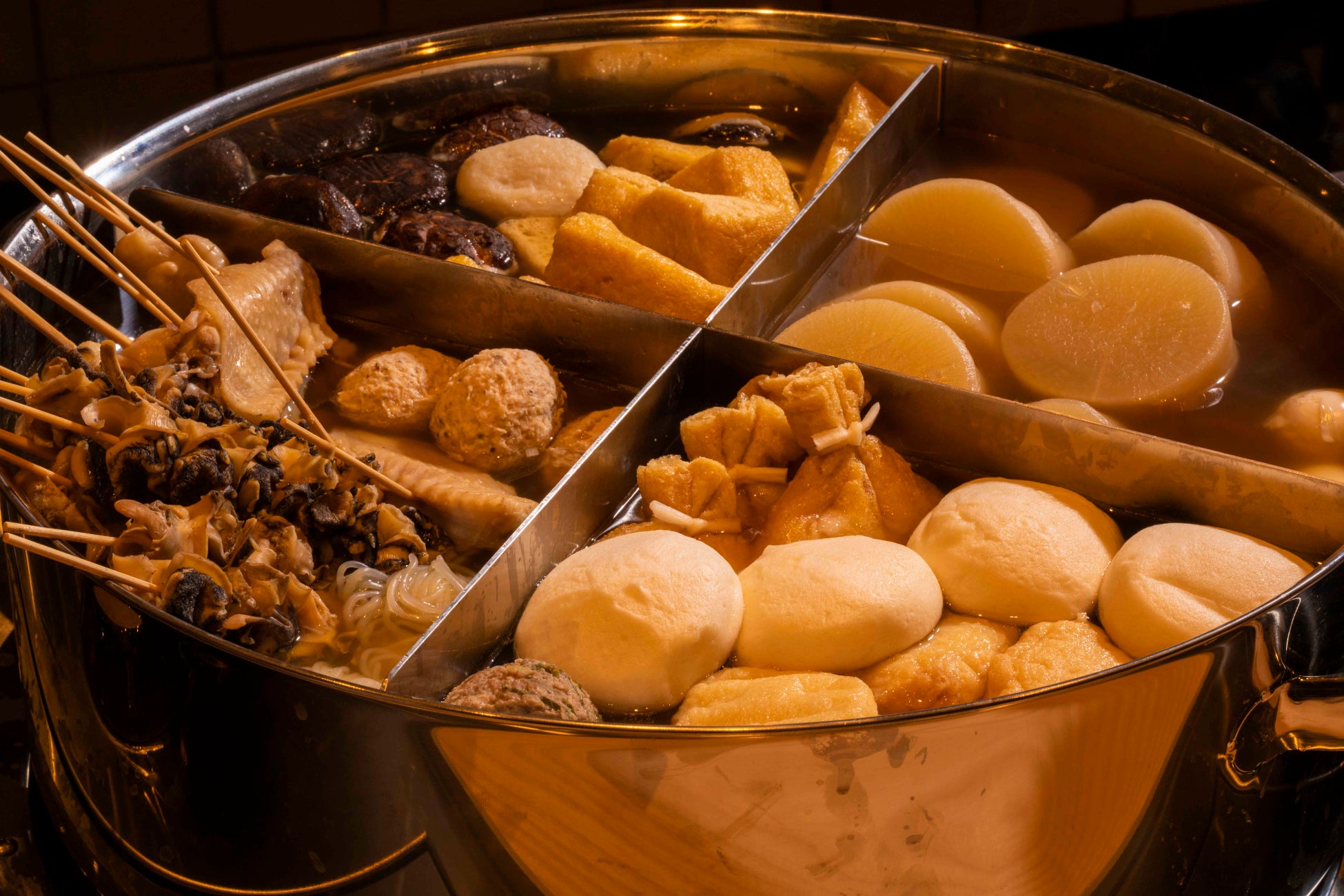 鰹と昆布・しい茸からとった澄んだ旨みの出汁に鶏がらを加えることによって、より深みの味わいに仕上げたおでんです。