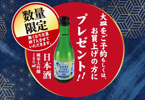 父の日『豪華盛』を含む、大皿商品をご予約・ご購入のお客様に、大皿商品1商品につき純米大吟醸酒(180ml)をプレゼントいたします!!お酒好きのお父さんには、喜ばれる事間違いなしです♪