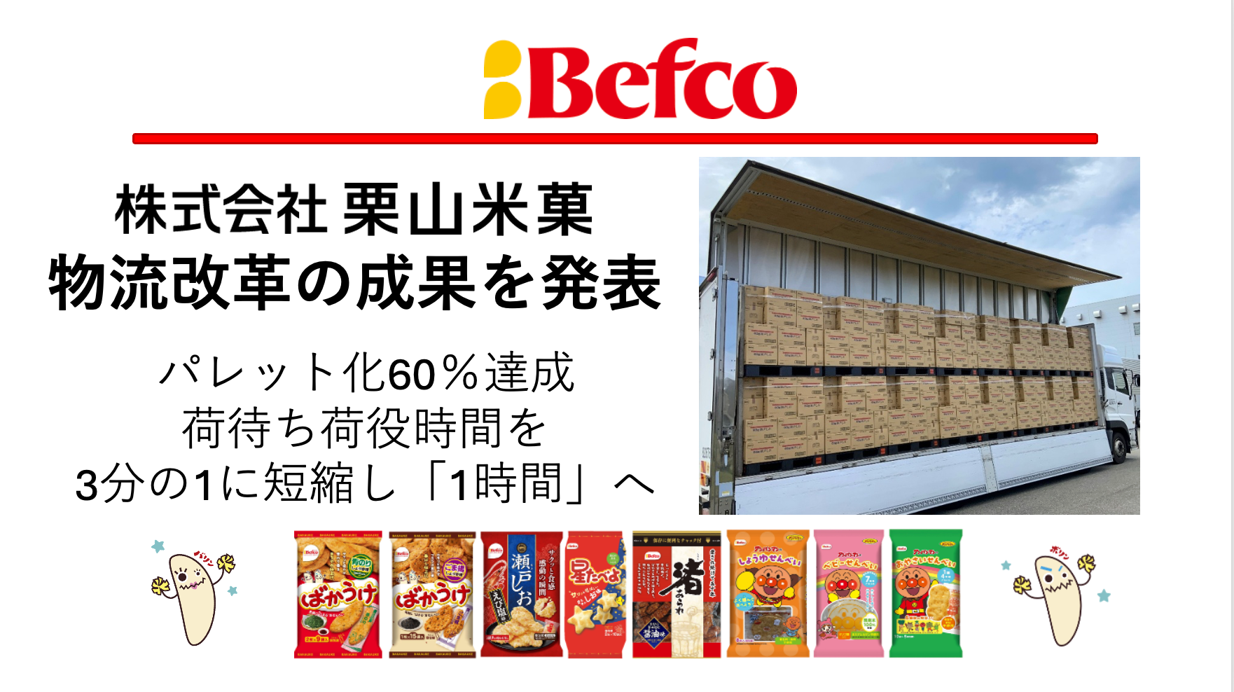 “ばかうけ”の栗山米菓、物流改革の成果を発表 パレット化60%達成、荷待ち荷役時間を3分の1に短縮し「平均1時間」へ
