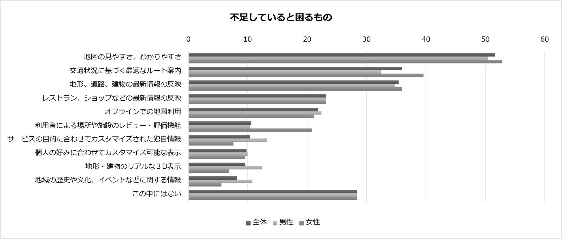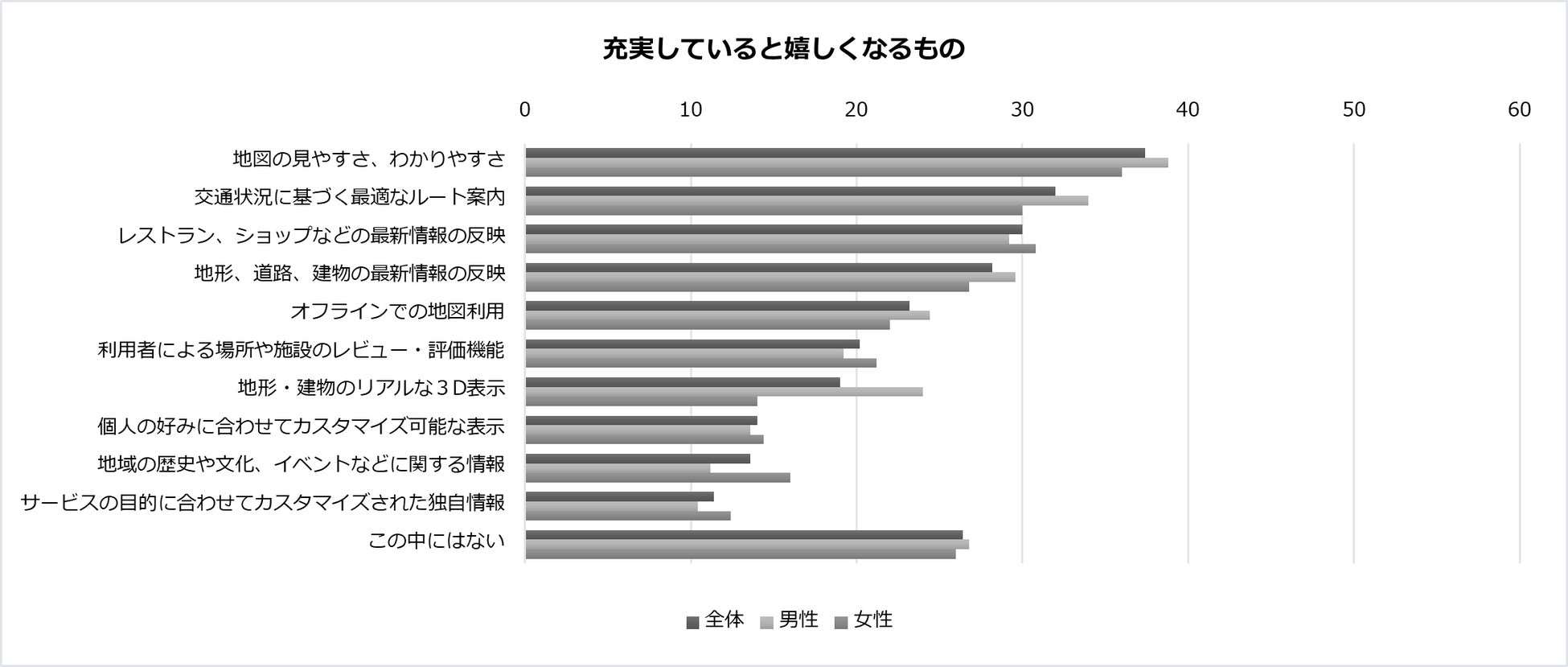 また、地図サービスで「不足していると困るもの」「充実していると嬉しくなるもの」でトップ4が同じ結果になり、3位と4位の「レストラン、ショップなどの最新情報の反映」「地形、道路、建物の最新情報の反映」が入れ替わるのみでした。