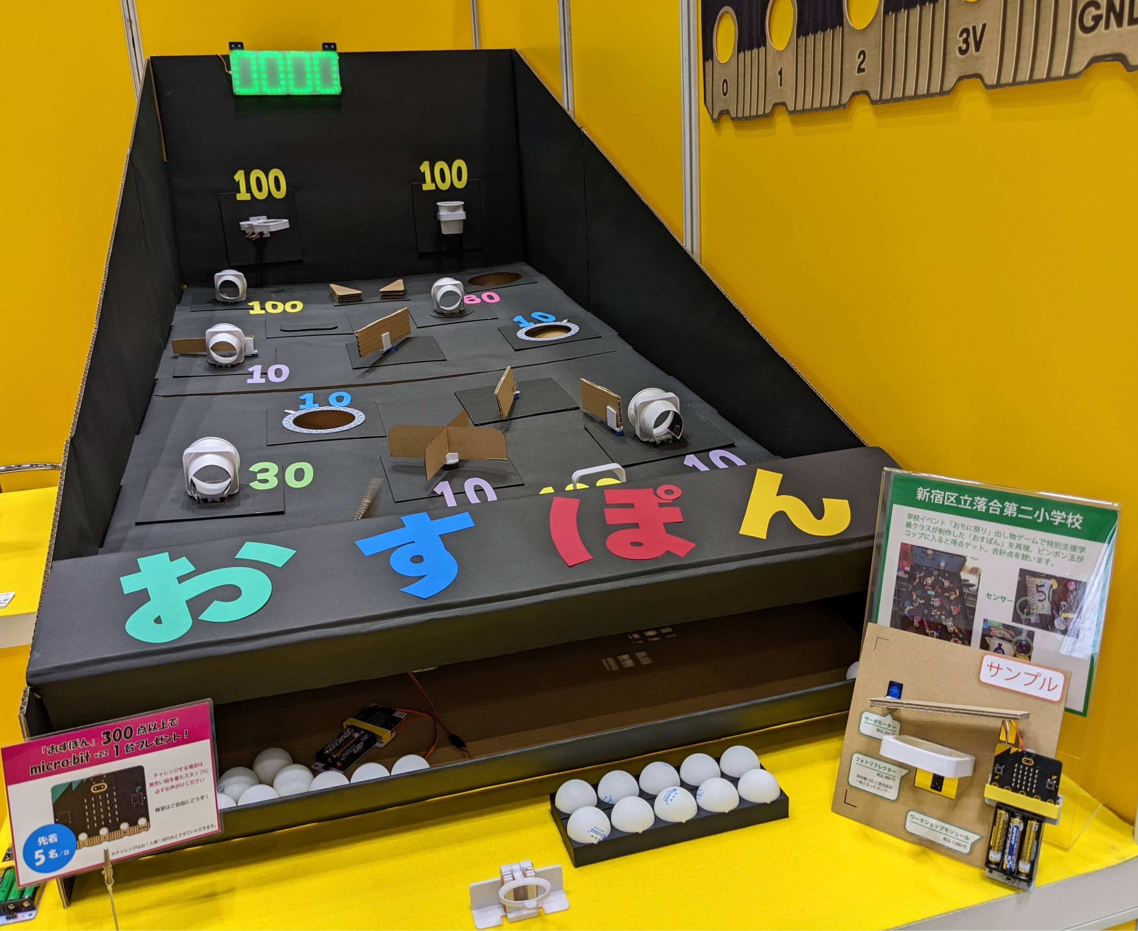 新宿区立落合第二小学校さまの学校イベントで制作された出し物ゲーム「おすぽん」を再現、デモ展示しています。micro:bit にセンサーやアクチュエーターを追加しており、一歩進んだ実例となっています。