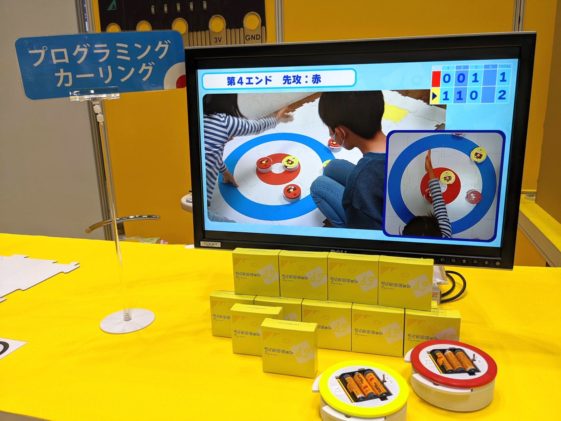 子供向けワークショップや教員向けイベントで大好評な micro:bit を使ったカーリングマシンを展示しています。また、ワークショップの様子を動画でご紹介しています。