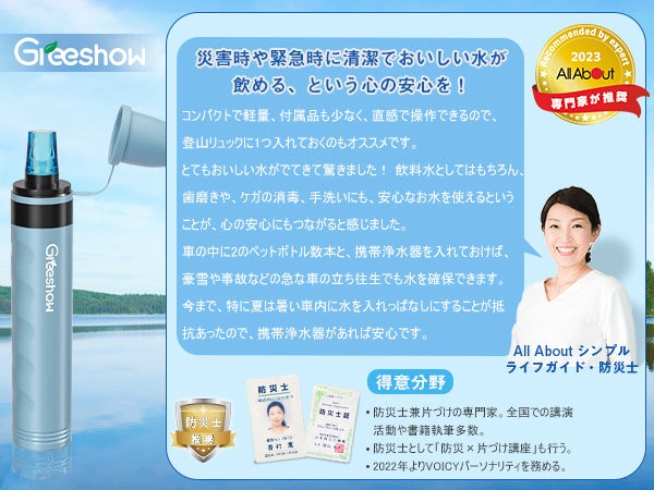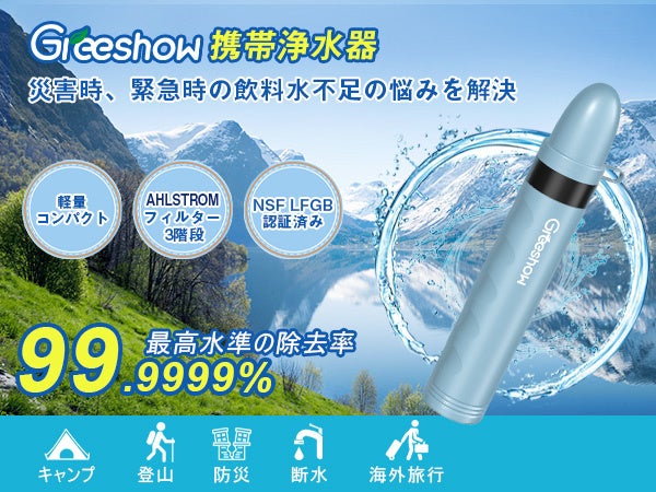 Greeshowの携帯浄水器は、災害や断水などの緊急時、地震、津波、台風、豪雨などの自然災害が発生した時、川やため池の水、お風呂の残り水などを安心して飲めるほど透き通った清潔な飲料水にろ過することができます。大切な家族の為の災害時の備え! 緊急用に一つ常備しておくことをおすすめします。