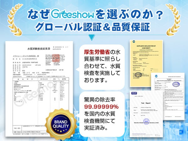 厚生労働省の徹底した食品衛生基準に照らし合わせて、水質検査を実施しております。プロも信頼するほどの安全品質であることを水質検査成績書にて証明されております。アメリカのNSF認証機関、ヨーロッパのLFGBの厳しい食用水安全基準をクリアした水質であることも実証済みです。