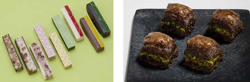トルコの伝統菓子「バクラヴァ」。定番のピスタチオバクラヴァにベルギー産ダークチョコレートを生地に練り込みました。本場トルコでも人気の味で、日本では松屋銀座限定でのご案内です。