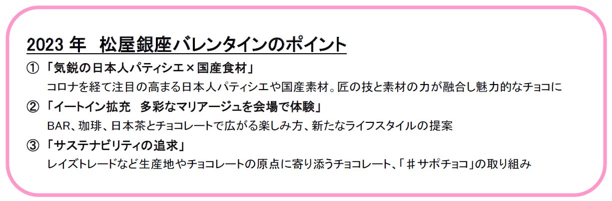 松屋銀座では、2023年2月1日(水)~14日(火)、8階イベントスクエアで「GINZA バレンタインワールド」を開催します。行動制限の無く活況だった昨年のクリスマス商戦同様、バレンタインも3年ぶりに行動制限が無く、来店者数の増加が見込まれます。そこで、イートインや実演販売を拡充するなど会場の楽しさを磨き来場を促します。