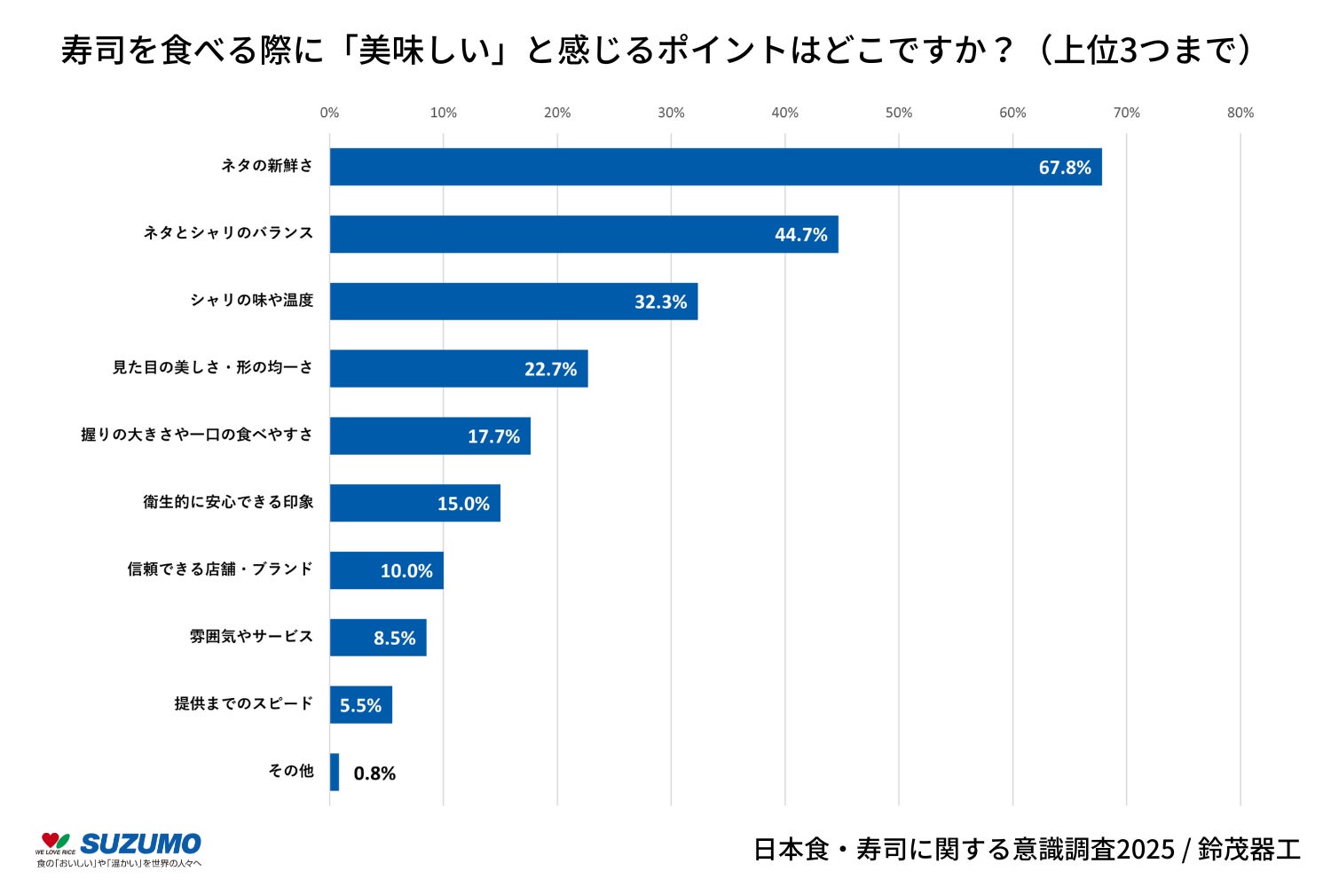 寿司を食べる際に「美味しい」と感じるポイントは、「ネタの新鮮さ」(67.8%)、「ネタとシャリのバランス」(44.7%)、「シャリの味や温度」(32.3%)がトップ3でした 。機械化によるメリットである「見た目の美しさ・形の均一さ」(22.7%)も4位となり、消費者が美味しさを判断する重要な要素であることが示されました。