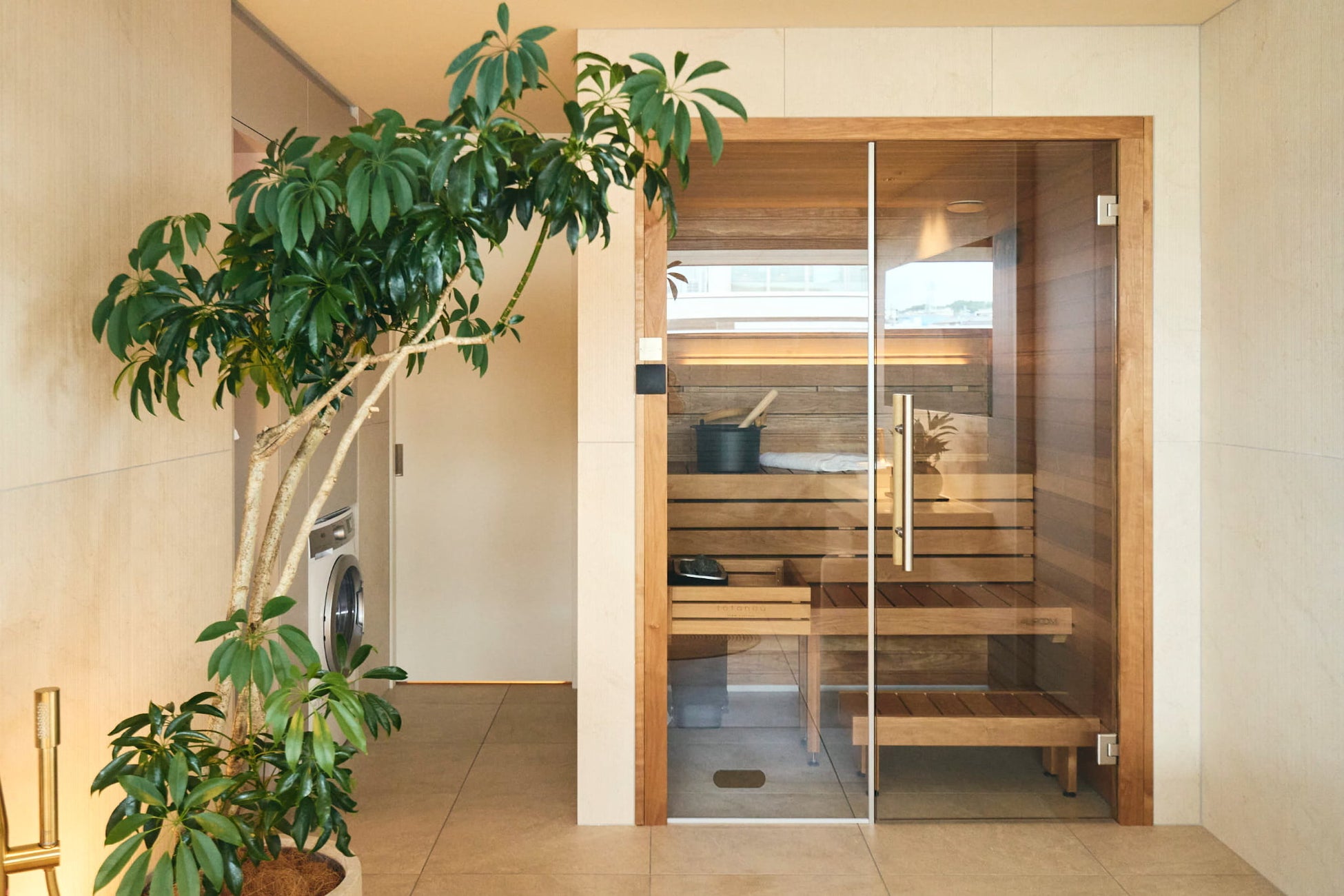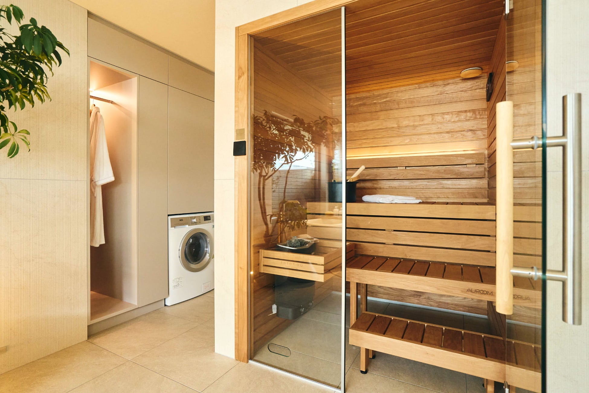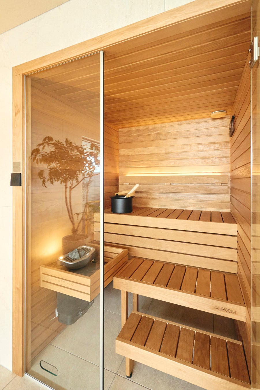 ガラスと木が調和した北欧ならではのミニマルでスタイリッシュなデザインが特徴で、ガラス面に耐熱強化ガラスを使用することで、熱を逃がさず、機能性とデザイン性の両立を実現。最高温度は110度、ロウリュも可能な本格仕様となっています。