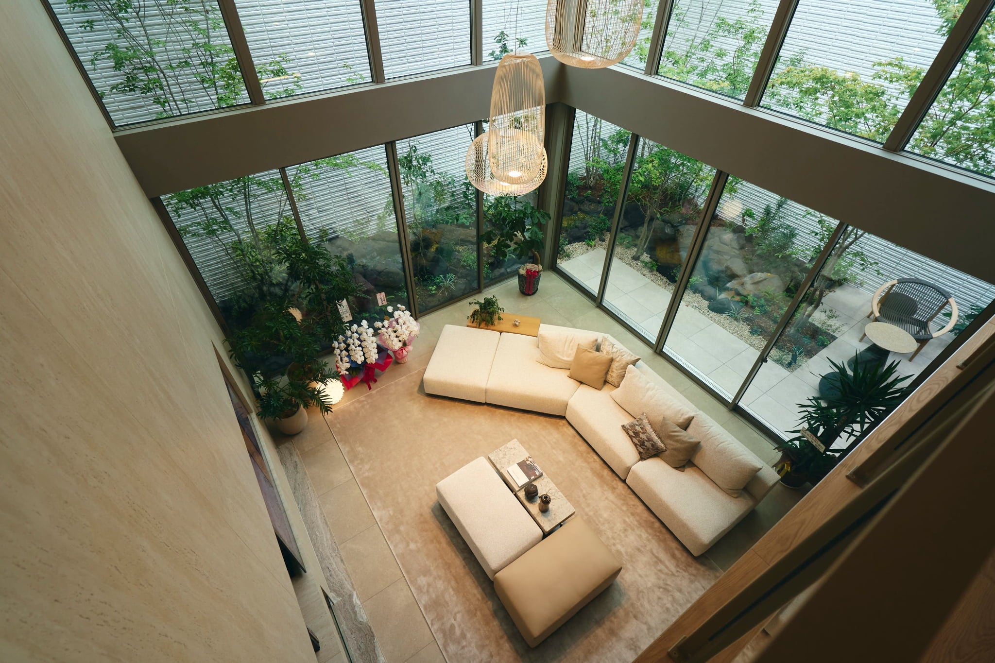 約5m×5mの大きな吹き抜けがあるLDKが特徴の本展示場は、外とのつながりを感じながらも高いプライバシー性を確保した、開放的で心地よい空間が広がっています。