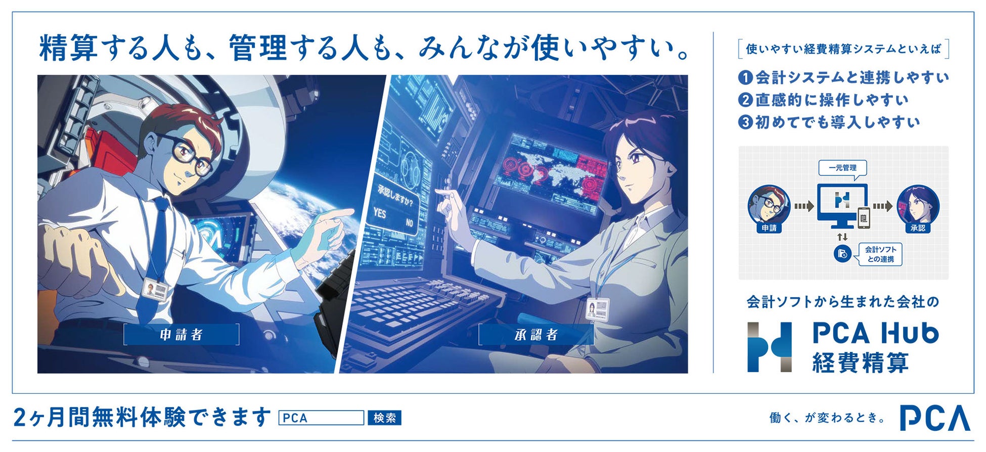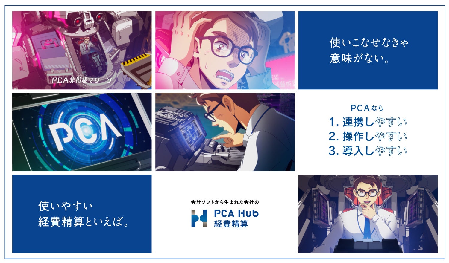 『PCA Hub 経費精算』の特長を、幅広い世代に伝えるため、現役世代が夢中でTVアニメを見ていた時代を思いおこさせる様な、少し太めの線と、やわらかい色味のアニメーションが、なつかしい時代を感じさせる演出となっています。