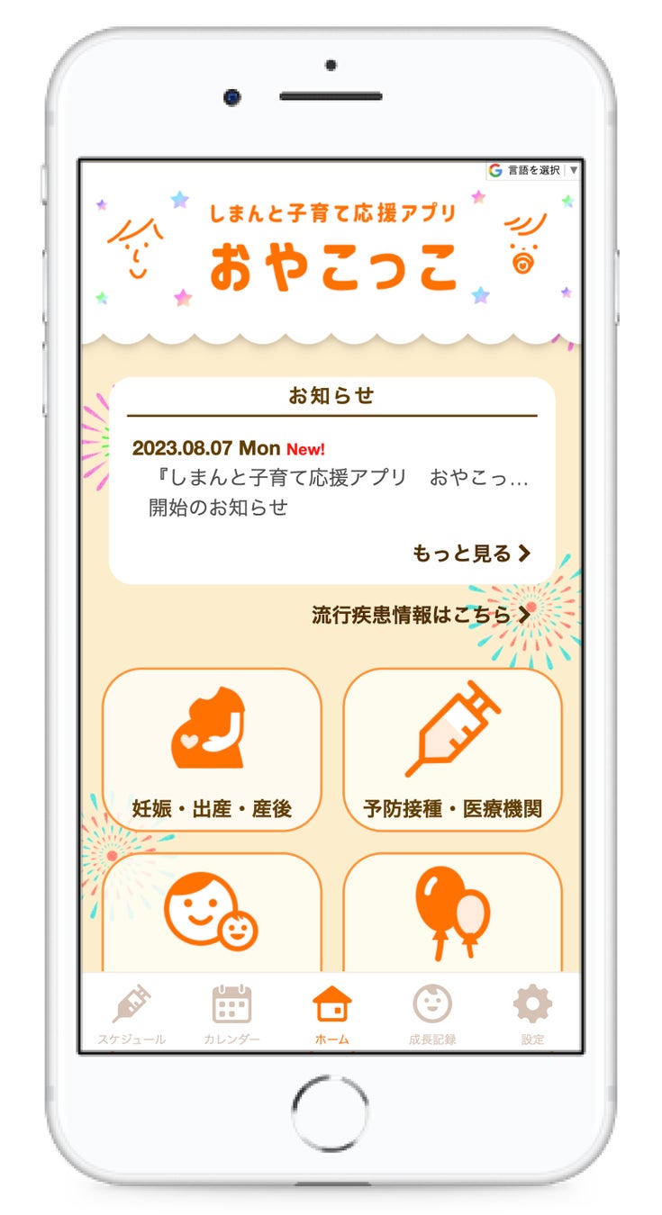 四万十市で初めて子育てガイドブックを作製した際に、子育て中のお母さんが提案してくださった「おやこっこ」という名称を長年大切に使用し、慣れ親しんできました。このアプリも四万十市の「おやこ」にとって親しみやすく、役立てていただけるものにしたいという想いを込めて、「しまんと子育て応援アプリ おやこっこ」と命名しました。トップページは四万十子育て応援サイトの雰囲気に合わせた明るく、あたたかい色味で構成しています。四万十市らしさが詰まった、こだわりのデザインでお届けします。