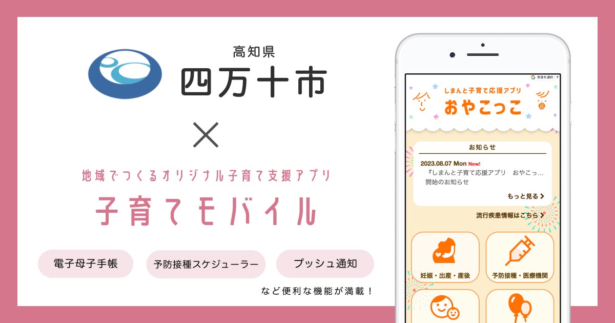 自治体向けサービスを開発する株式会社ミラボ(本社:東京都千代田区、代表取締役:谷川一也、以下「ミラボ」)の子育て支援アプリ「子育てモバイル」が、高知県 四万十市に導入され、「しまんと子育て応援アプリ おやこっこ」として8月7日より提供を開始します。