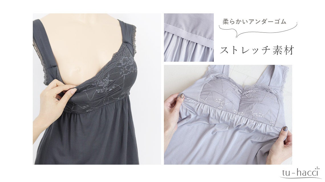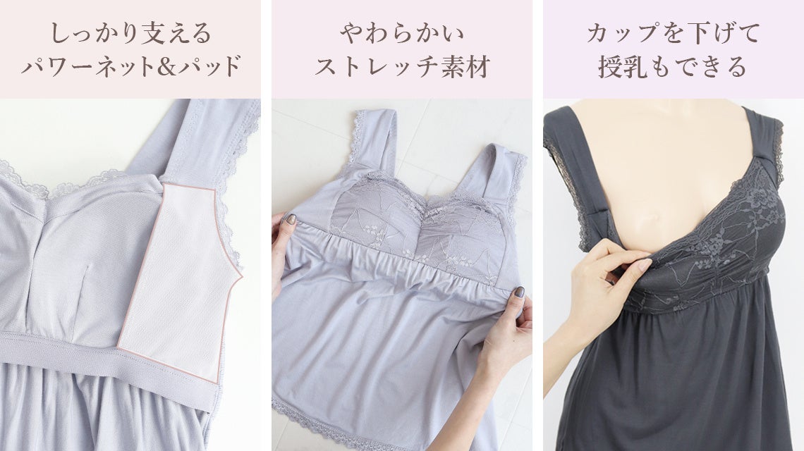 レーヨン混の生地は肌当たりも柔らかく、産前産後のデリケートな体にも優しい仕様に。さらに伸縮性抜群のストレッチ素材を使用することで、就寝中の息苦しさも解消。とろみのある生地がやみつきになる触り心地で、ずっと着ていたくなる着心地です。さらに、カップ部分を伸ばして授乳も簡単に行うことができます。