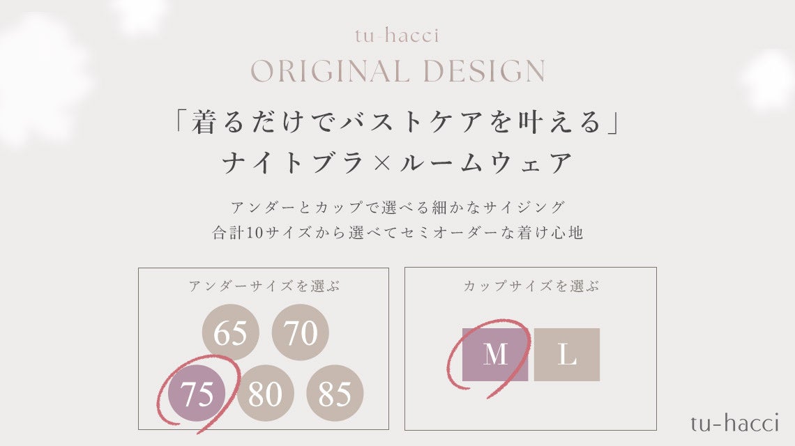 元々、ラクシアスリープで最初に開発されたのはナイトブラでした。そこから、ナイトブラの機能をそのままルームウェアに搭載し、一体型にした「ラクシアスリープ ナイトブラワンピース」を開発。ナイトブラを着けてからルームウェアを着るという手間を省き、よりラクな着心地を追求。tu-hacci独自の"バストを丸ごと包み込む設計"で、就寝中のバストの横流れを防ぎ、寝返り等の揺れからバストを守ります。普段からナイトブラが続かない人でも、ルームウェアを着る行為と一緒になることで日々のバストケアを継続しやすくなります。