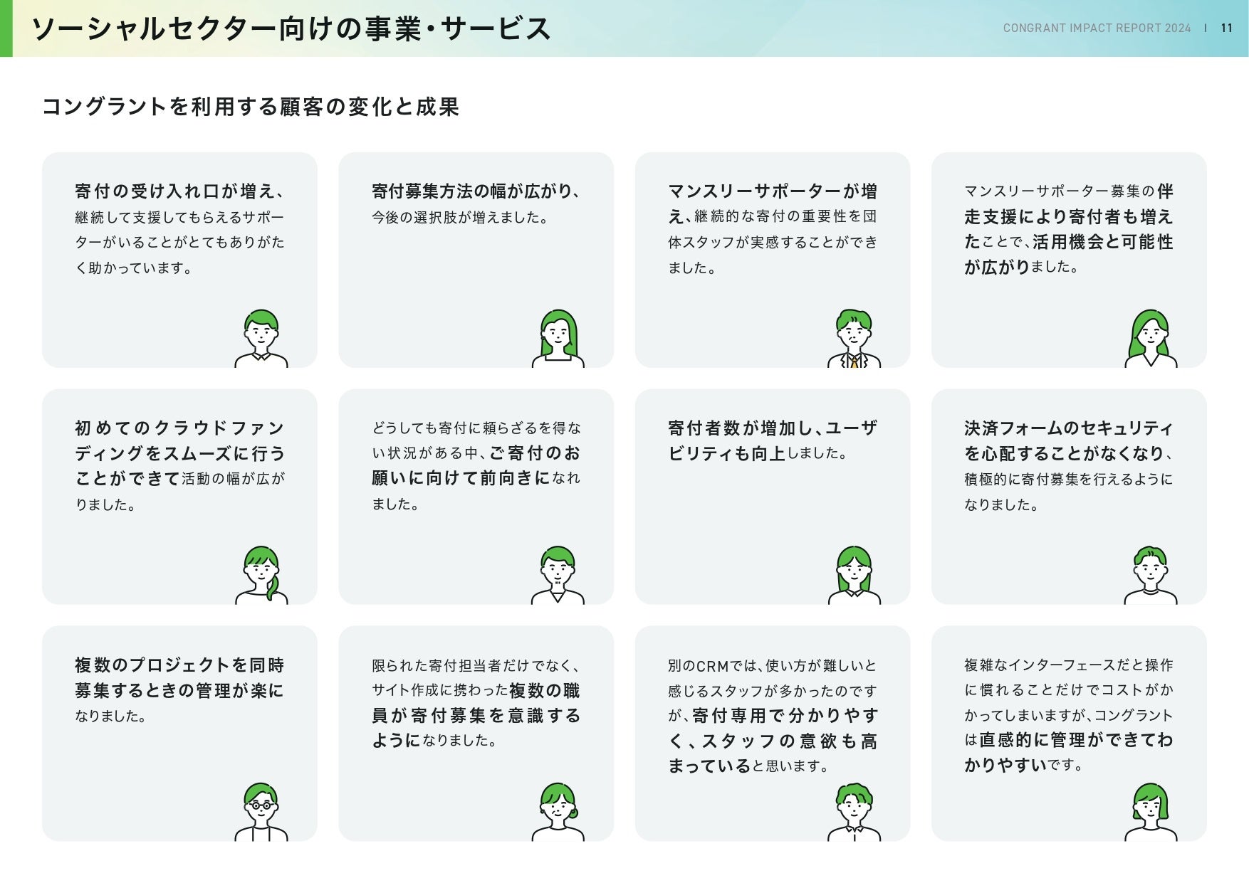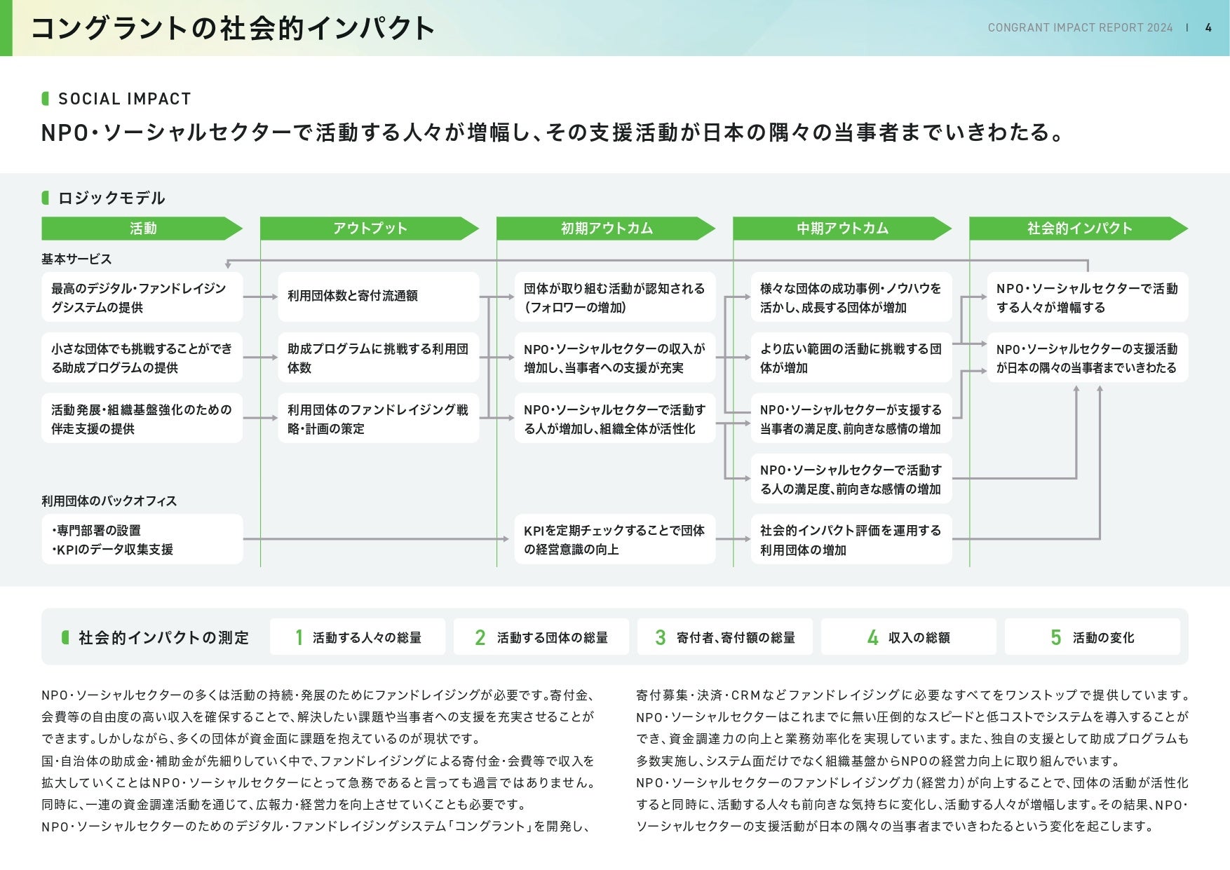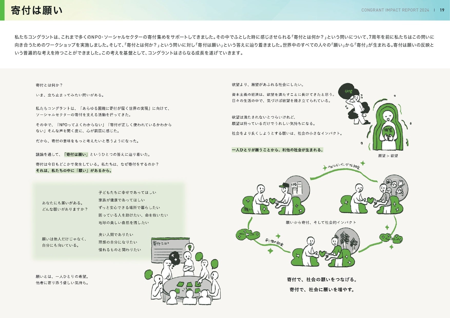 ソーシャルセクターと企業向けに「寄付DXシステム」を提供するコングラント株式会社(本社:大阪市西区、代表取締役:佐藤正隆、以下「コングラント」)は、コングラントのこれまでの実績やソーシャルセクターや企業に提供できた社会的インパクトについてまとめた「インパクトレポート2024」を発行しました。本レポートでは、寄付の存在を問う様々な議論から辿り着いた「寄付は願い」という、弊社が考える「寄付」についてもご覧いただけます。