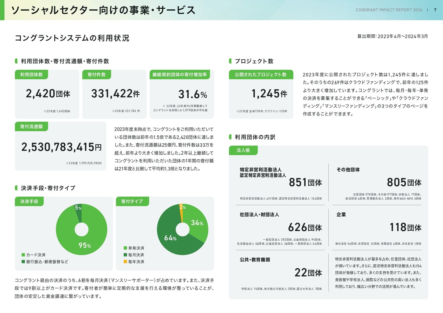 2023年度末時点で、コングラントをご利用いただいている団体数は前年の1.5倍である2,420団体に達しました。また、寄付流通額は25億円、寄付件数は33万を超え、前年より大きく増加しました。