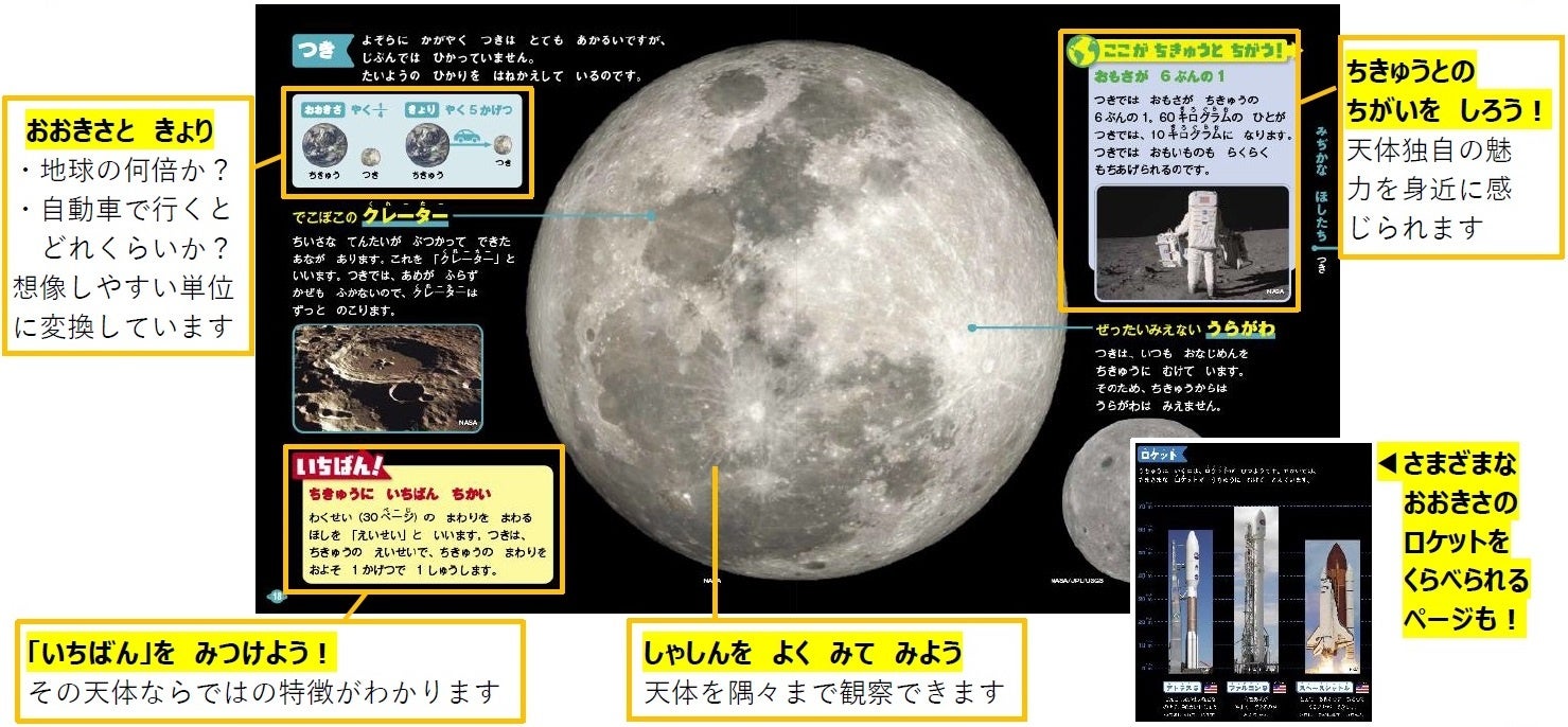 ・宇宙飛行士、宇宙人、星座、人工衛星、ロケットなど、興味関心を刺激するコンテンツもたっぷり収録。