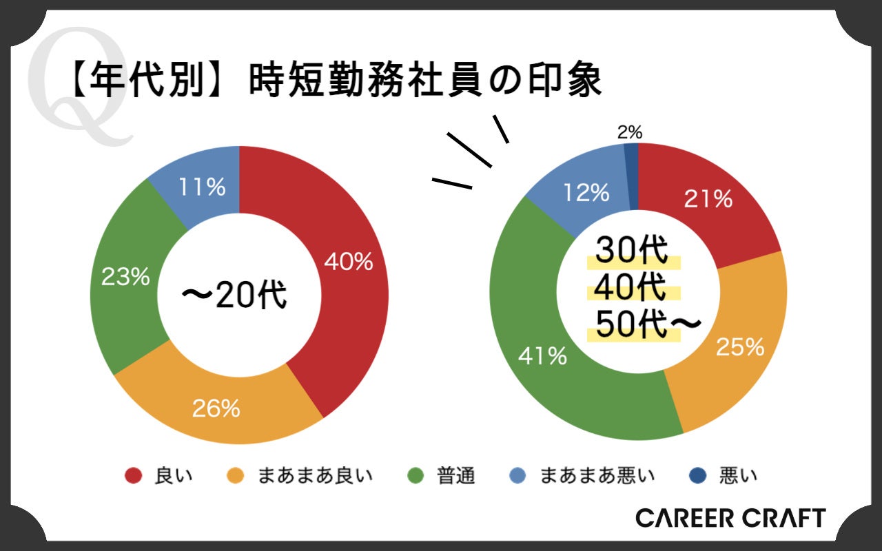 「多様性の時代だと思うので、社員ひとりひとりのために働きやすい環境を作ることはとても良いことだと思うため。」(男性・〜20代前半・時短勤務の印象「良い」)