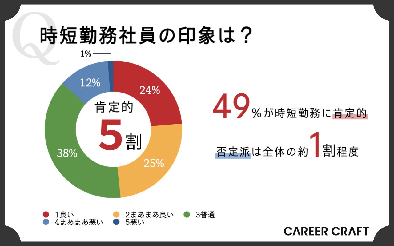 アンケートの結果、49%という約半数の人たちが時短勤務に対して好意的な意見を持っていることが分かりました。また、「何とも思わない(普通)」が38%を占めており、全体の87%は時短勤務に対して悪い印象を持っていないことが分かりました。