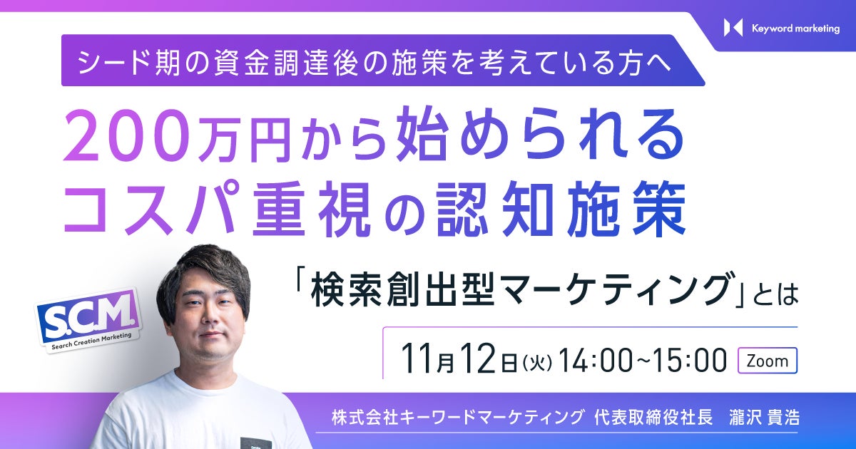 株式会社ベクトル(本社:東京都港区、代表取締役会長兼社長:西江 肇司、東証プライム:6058)の子会社である株式会社キーワードマーケティング(本社:東京都港区、代表取締役会長:滝井 秀典、以下 キーワードマーケティング)は、無料オンラインセミナー『シード期の資金調達後の施策を考えている方へ 200万円から始められるコスパ重視の認知施策 検索創出型マーケティングとは』を11月12日(火)14時より開催いたします。