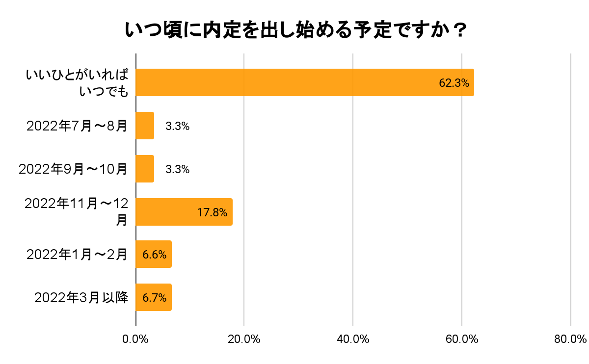 アンケートにて企業が内定を出すタイミングとしてもっとも多くの回答を得たのが、「いいひとがいればいつでも」(62.3%)という結果となった。