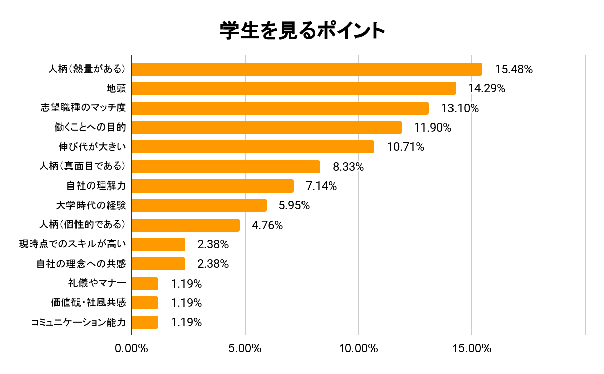 企業の多くは学生との選考段階で「人柄(熱量)」をもっとも重視することが多いことが分かった。
