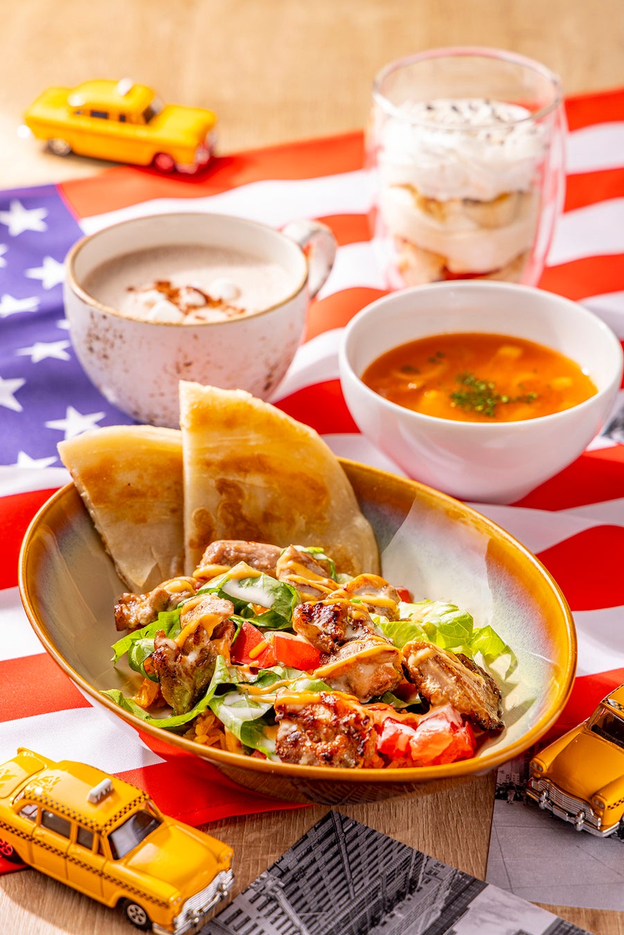 12月のニューヨークテーマでは、メインにチキンオーバーライス、サイドにマンハッタン クラムチャウダー、ドリンク(セット別料金)はフローズン ホットチョコレート、デザート(セット別料金)はバナナプディングとまさにニューヨークの定番メニューが一度に愉しめる内容となっています。
