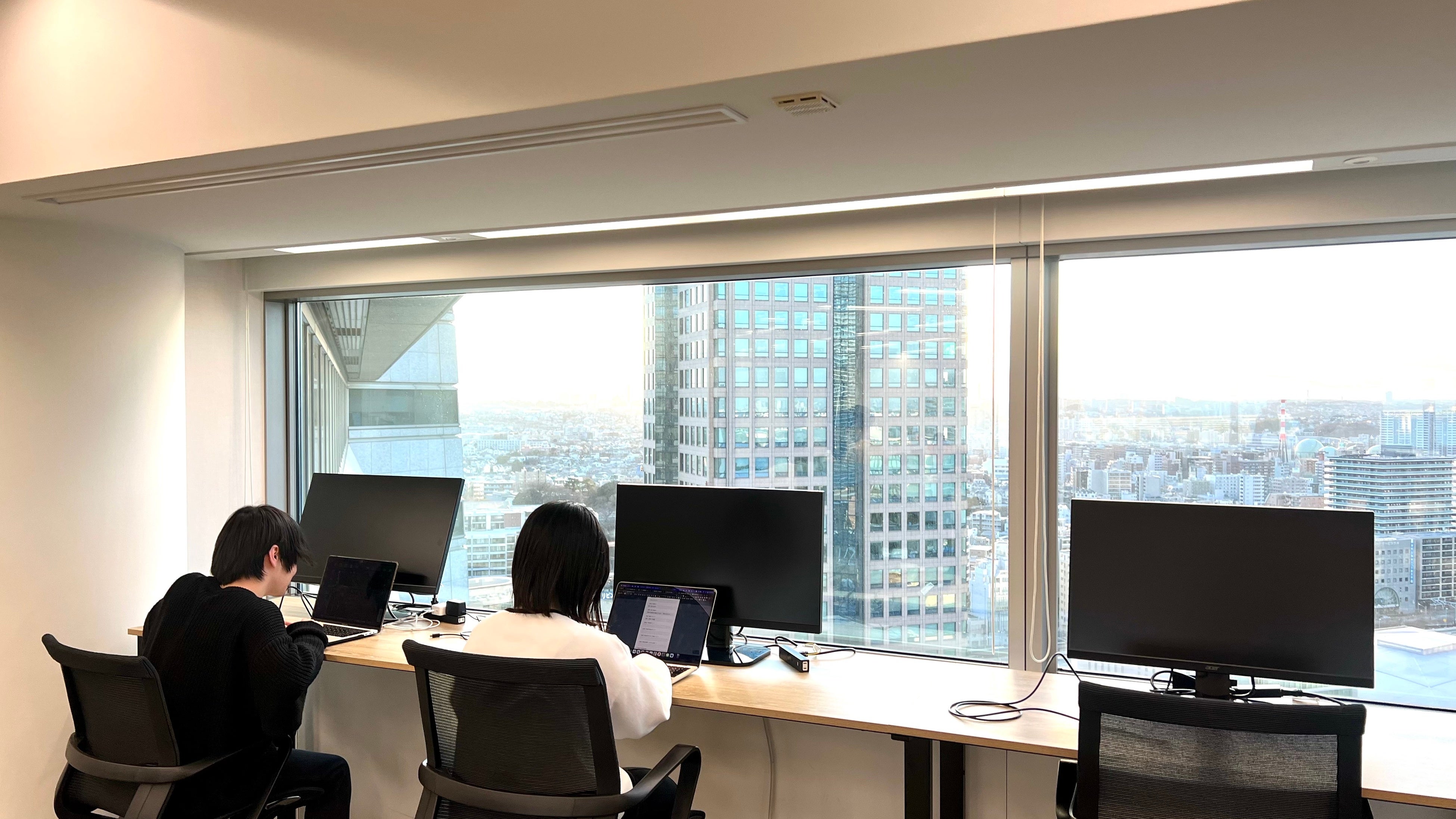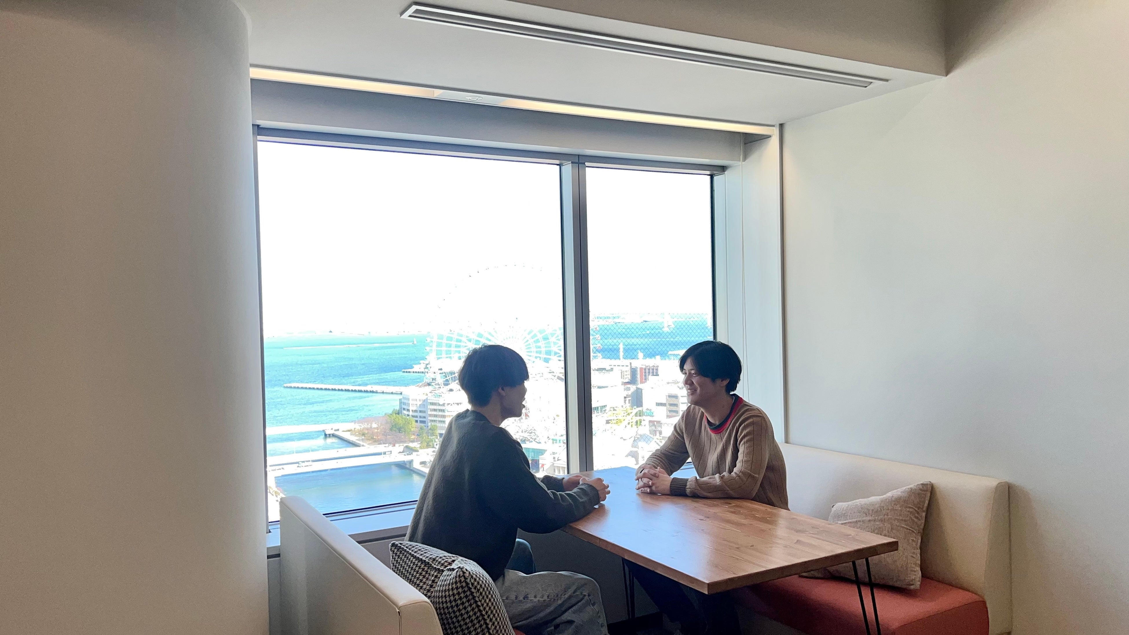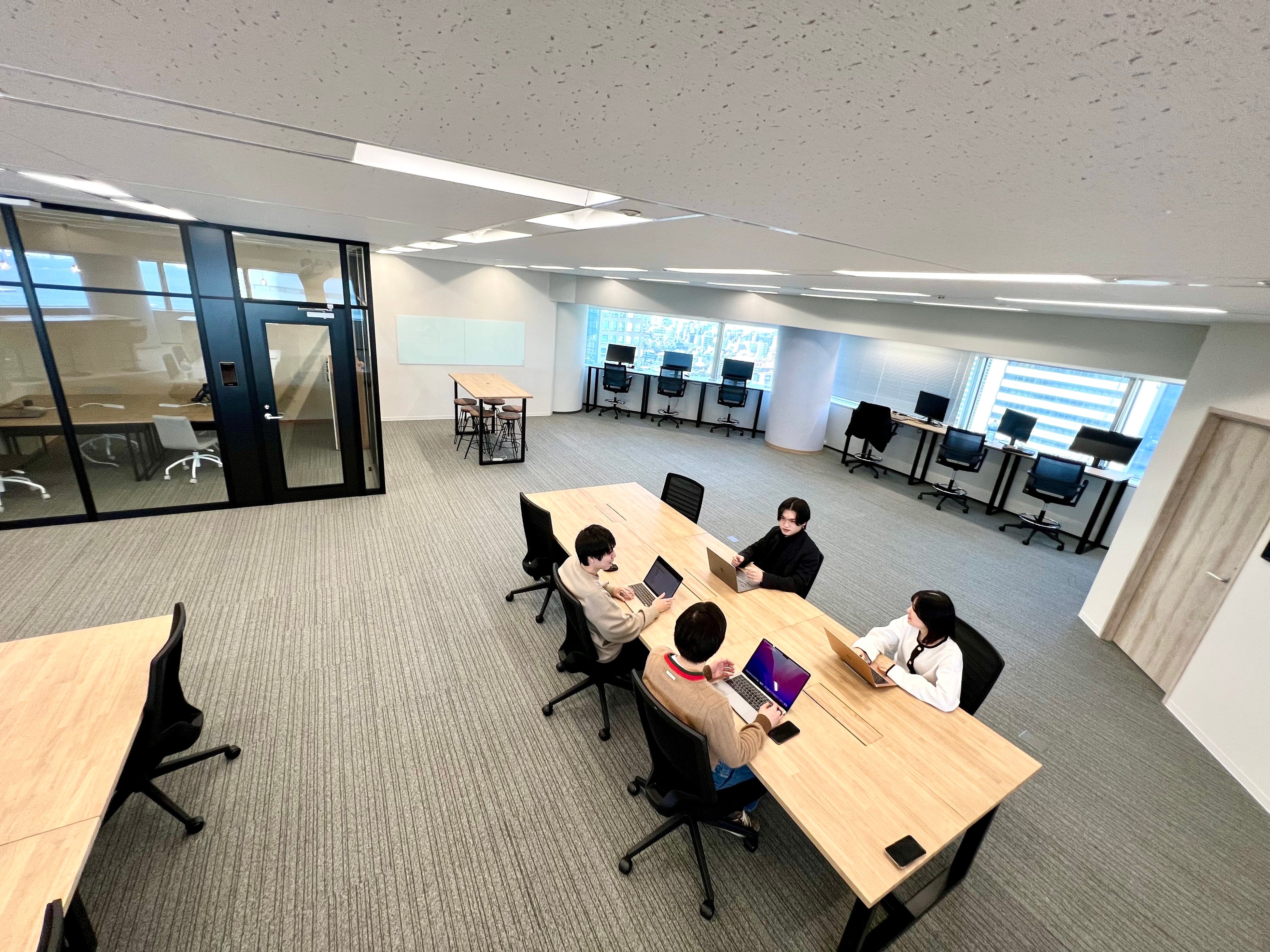 一面ガラス張りで、解放感があり、デザイン性の高い仕上がりの空間になります。疲れた目をみなとみらいの景色で癒し、集中した業務の一時の癒しになる効果を期待しています。また、圧迫感を軽減し、上長との距離を縮める効果を期待し、全席フリーアドレスにしました。