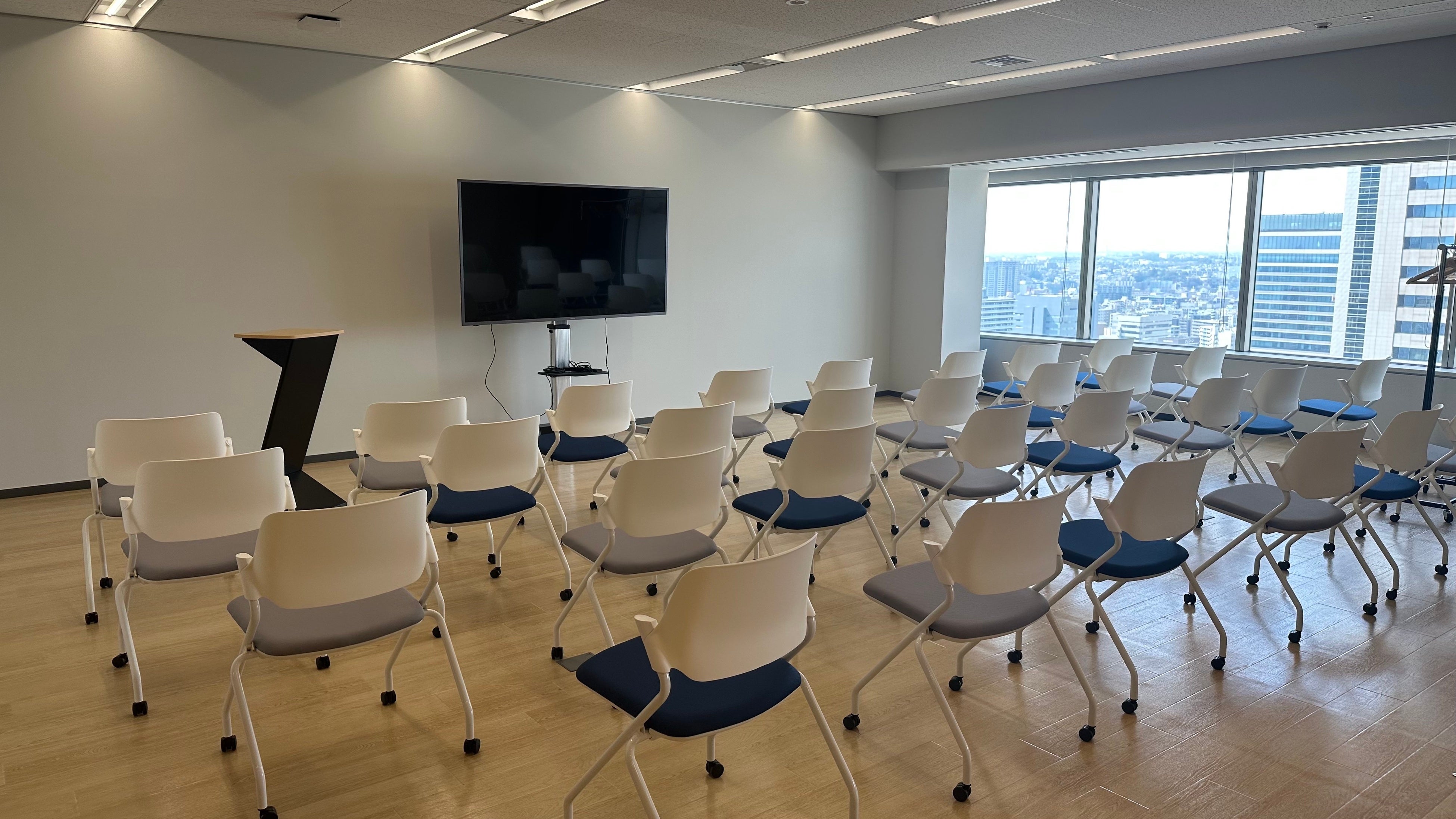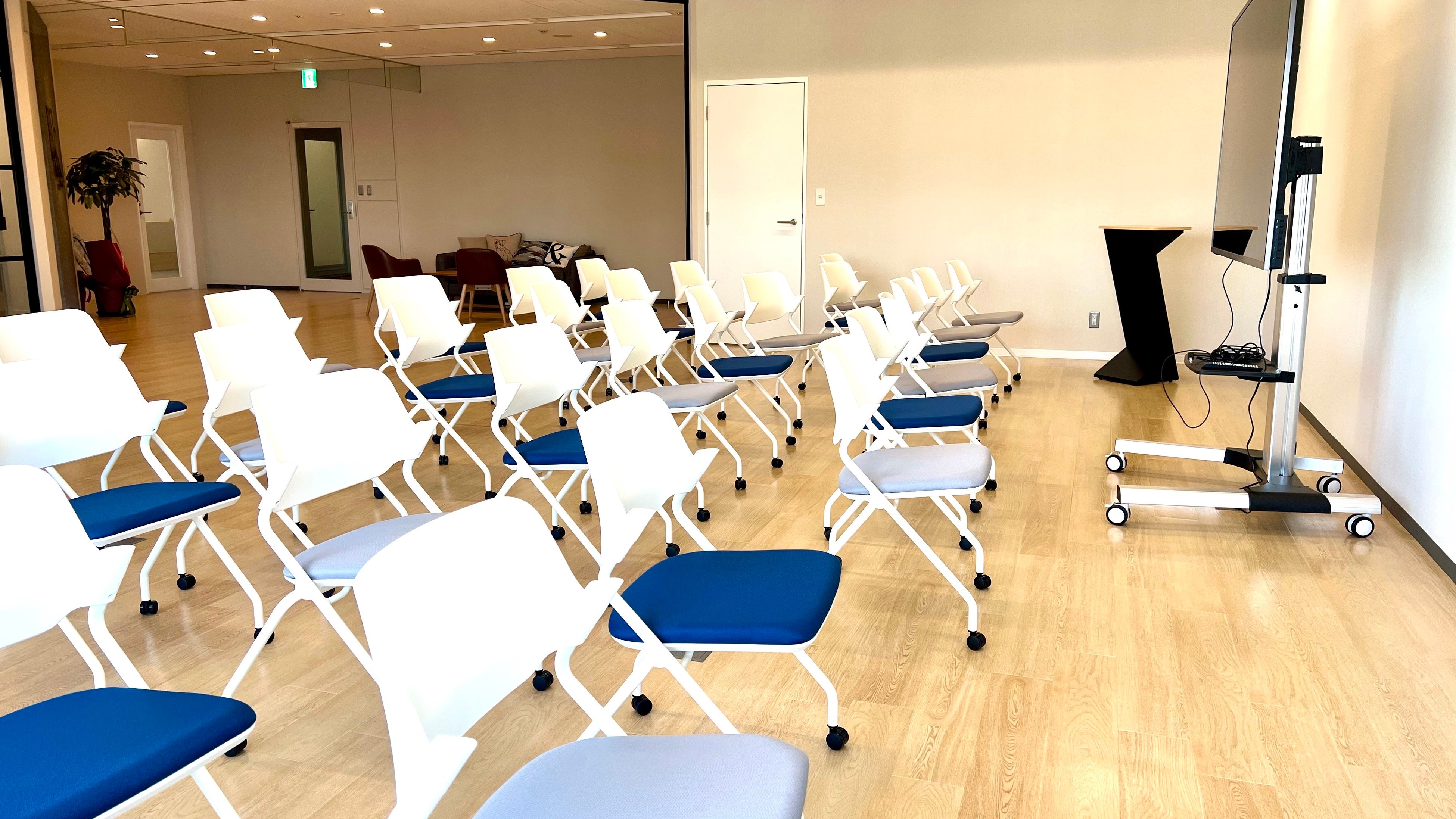 こちらのセミナーエリアは、自社開催のセミナーや、採用活動に使用されます。30人程度を収容することが可能であり、快適にセミナーを傍聴することができます。