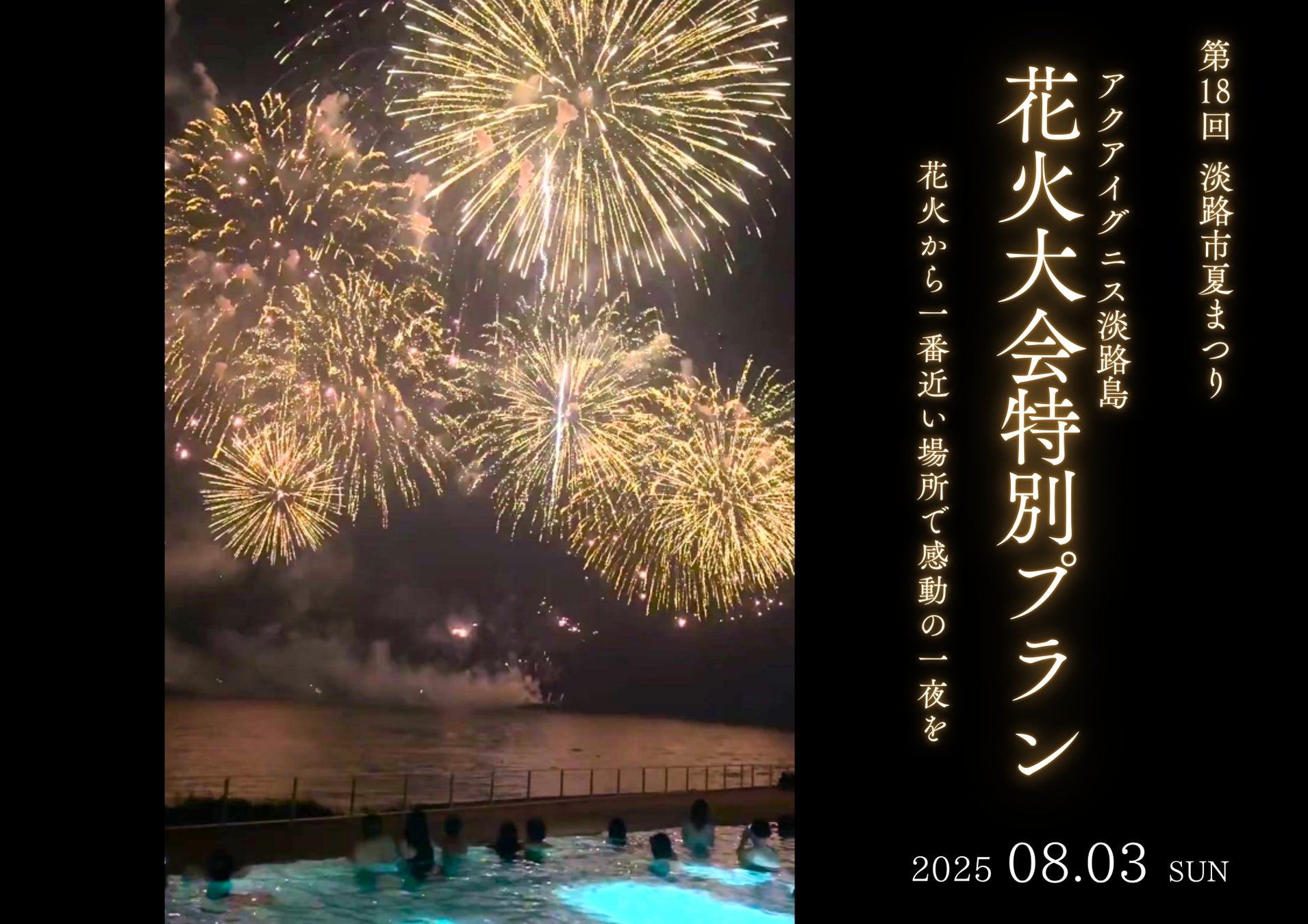 兵庫県淡路市のアクアイグニス淡路島は、大阪湾を一望できる“遮るもののない絶景ロケーション”。今年で18回目を迎える「淡路市夏まつり花火大会」。目の前の海上から打ち上がる約5,000発の花火は迫力満点で、視界いっぱいに広がり、心に残る夏の思い出に。この特別な日にふさわしいプランとして、特別観覧席や、プールに入りながら花火が楽しめる宿泊プラン、地元の旬を楽しむ美食ディナープランなど、花火大会を満喫する特別なサービスをご用意しました。